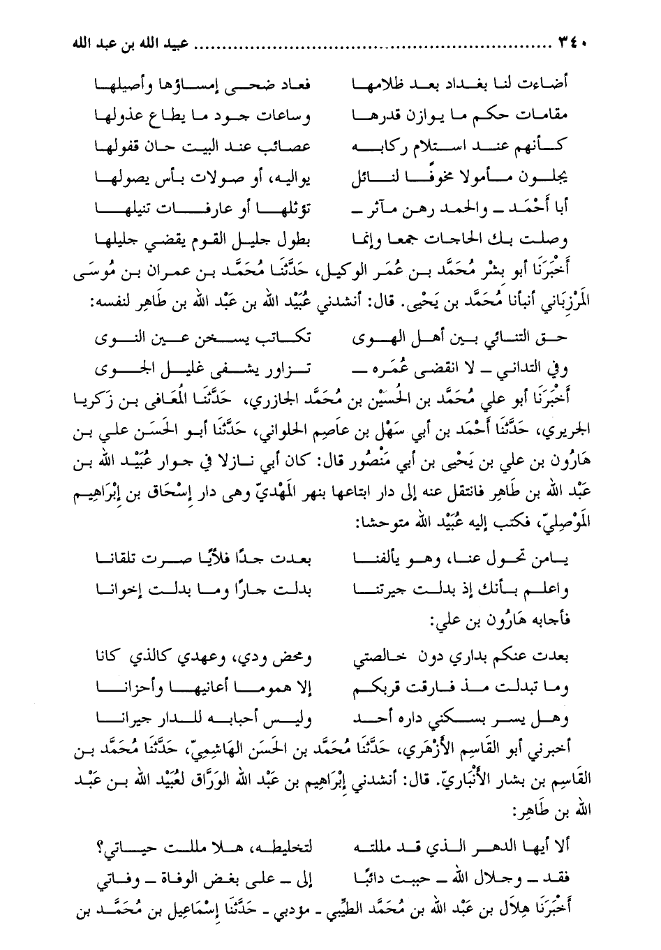 أَخْبَرَنَا أَبُو بشر مُحَمَّد بْن عُمَر الوكيل، حَدَّثَنَا محمد بن عمران بن موسى المرزباني أنبأنا محمد بن يحيى. قَالَ: أنشدني عُبَيْد اللَّهِ بْن عَبْد اللَّه بْن طاهر لنفسه: