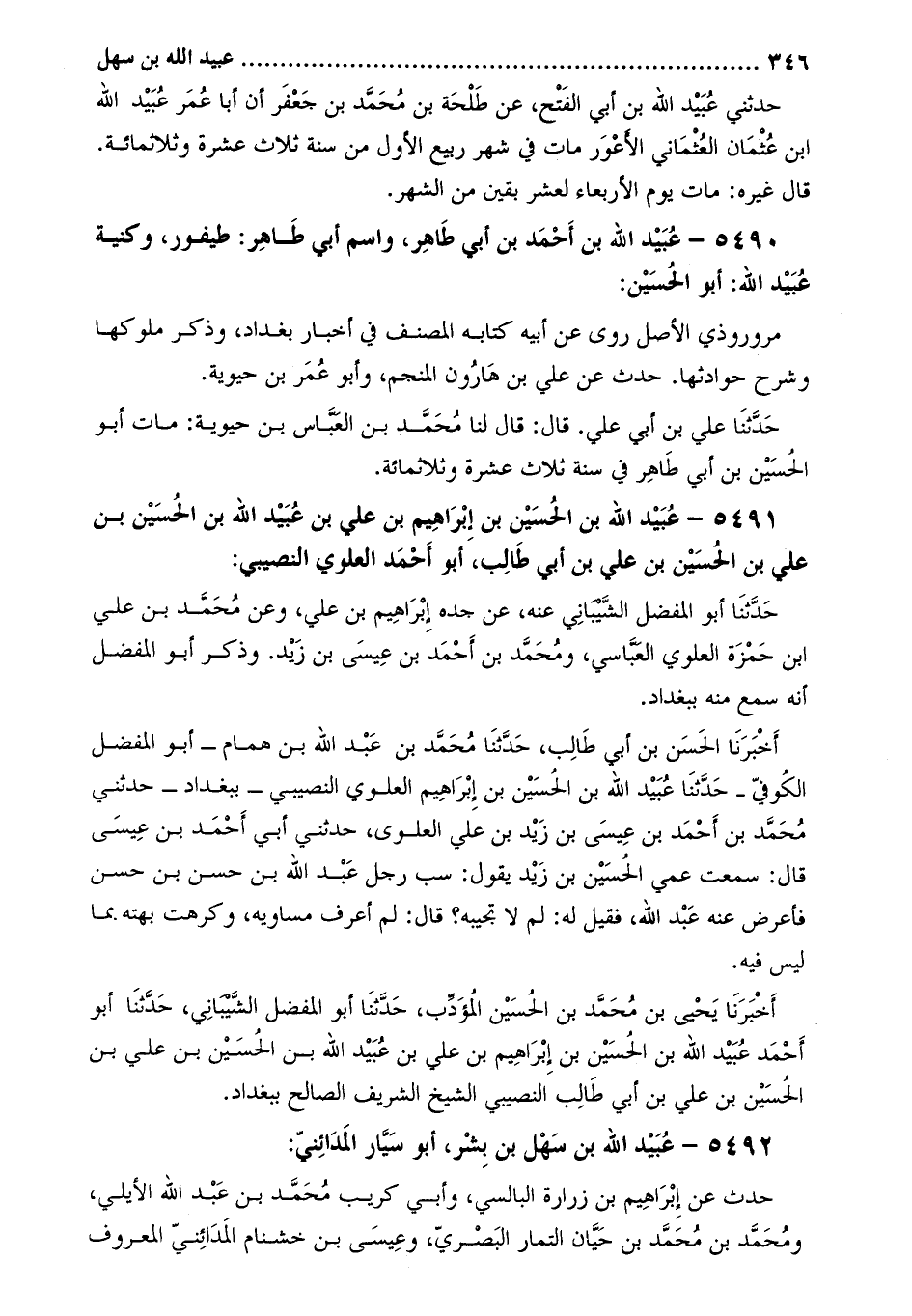 5490- عبيد الله بن أحمد بن أبي طاهر، واسم أبي طاهر: طيفور، وكنية عبيد الله: أبو الحسين: