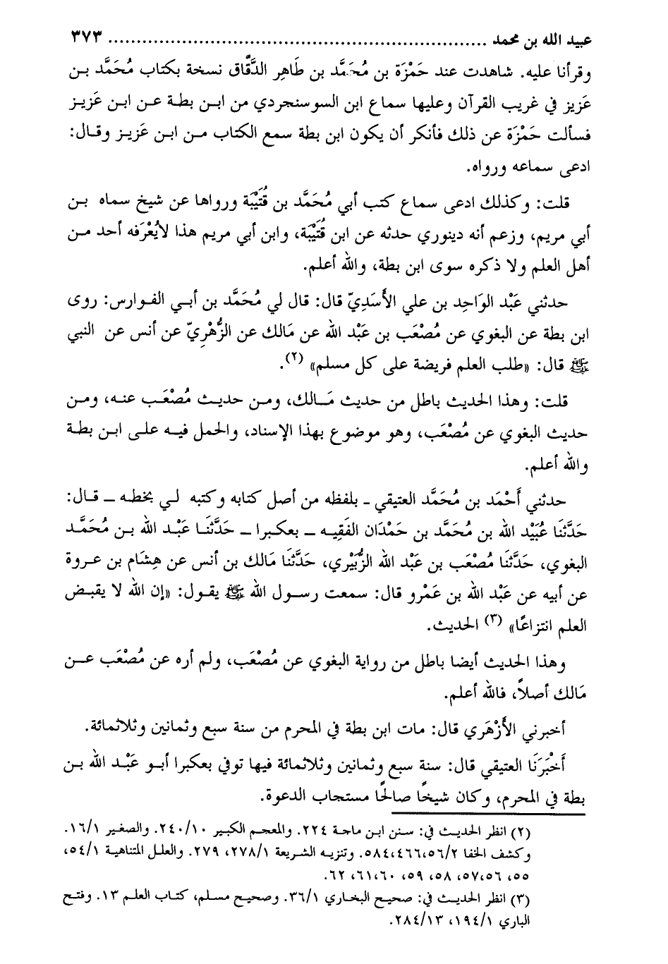 حَدَّثَنَا عُبَيْدُ اللَّهِ بْنُ مُحَمَّدِ بْنِ حَمْدَانَ الْفَقِيهُ- بعكبرا- حدّثنا عبد الله بن محمّد البغوي، حدّثنا مصعب بن عبد الله الزّبيري، حَدَّثَنَا مَالِكِ بْنِ أَنَسٍ عَنْ هِشَامِ بْنِ عُرْوَةَ عَنْ أَبِيهِ عَنْ عَبْدِ اللَّهِ بْنِ عَمْرٍو قَالَ: سَمِعْتُ رَسُولَ اللَّهِ صَلَّى اللَّهُ عَلَيْهِ وَسَلَّمَ يَقُولُ: «إِنَّ اللَّهَ لا يَقْبِضُ الْعِلْمَ انْتِزَاعًا» [2] الْحَدِيثُ.