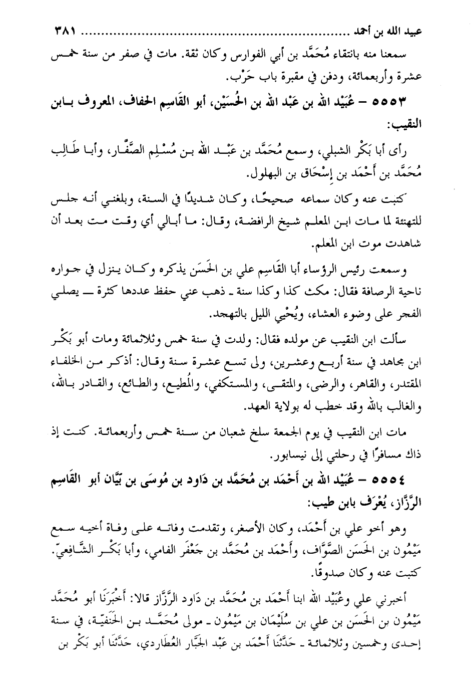 5553- عُبَيْد اللَّه بْن عَبْد اللَّه بْن الْحُسَيْن، أَبُو القاسم الحفاف، المعروف بابن النقيب [1] :