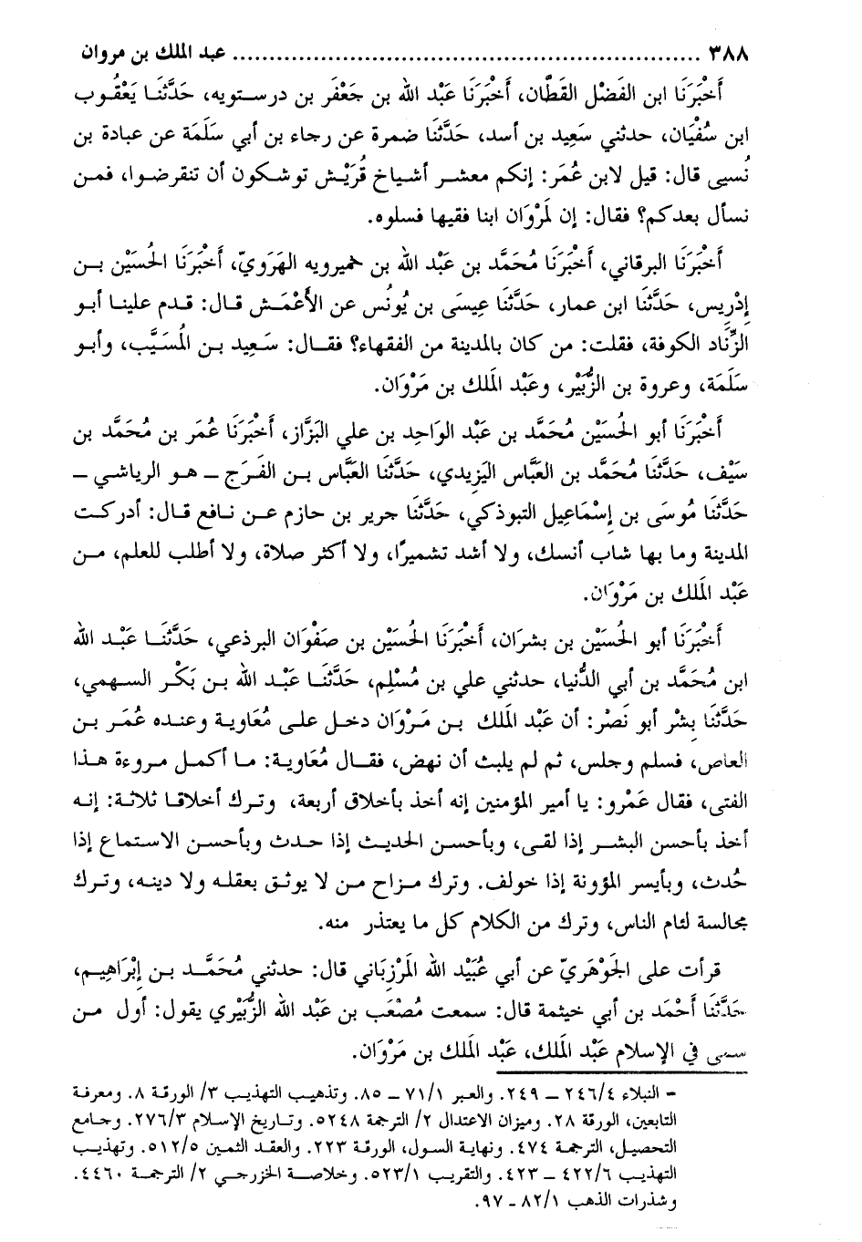 أَخْبَرَنَا أَبُو الْحُسَيْن مُحَمَّد بْن عَبْد الواحد بْن علي البزاز، أخبرنا عمر بن محمّد بن سيف، حدّثنا محمّد بن العبّاس اليزيدي، حدّثنا العبّاس بن الفرج- هو الرياشي- حدّثنا موسى بن إسماعيل التبوذكي، حَدَّثَنَا جرير بن حازم عن نافع قال: أدركت المدينة وما بها شاب أنسك، ولا أشد تشميرا، ولا أكثر صلاة، ولا أطلب للعلم، من عبد الملك بن مروان.
