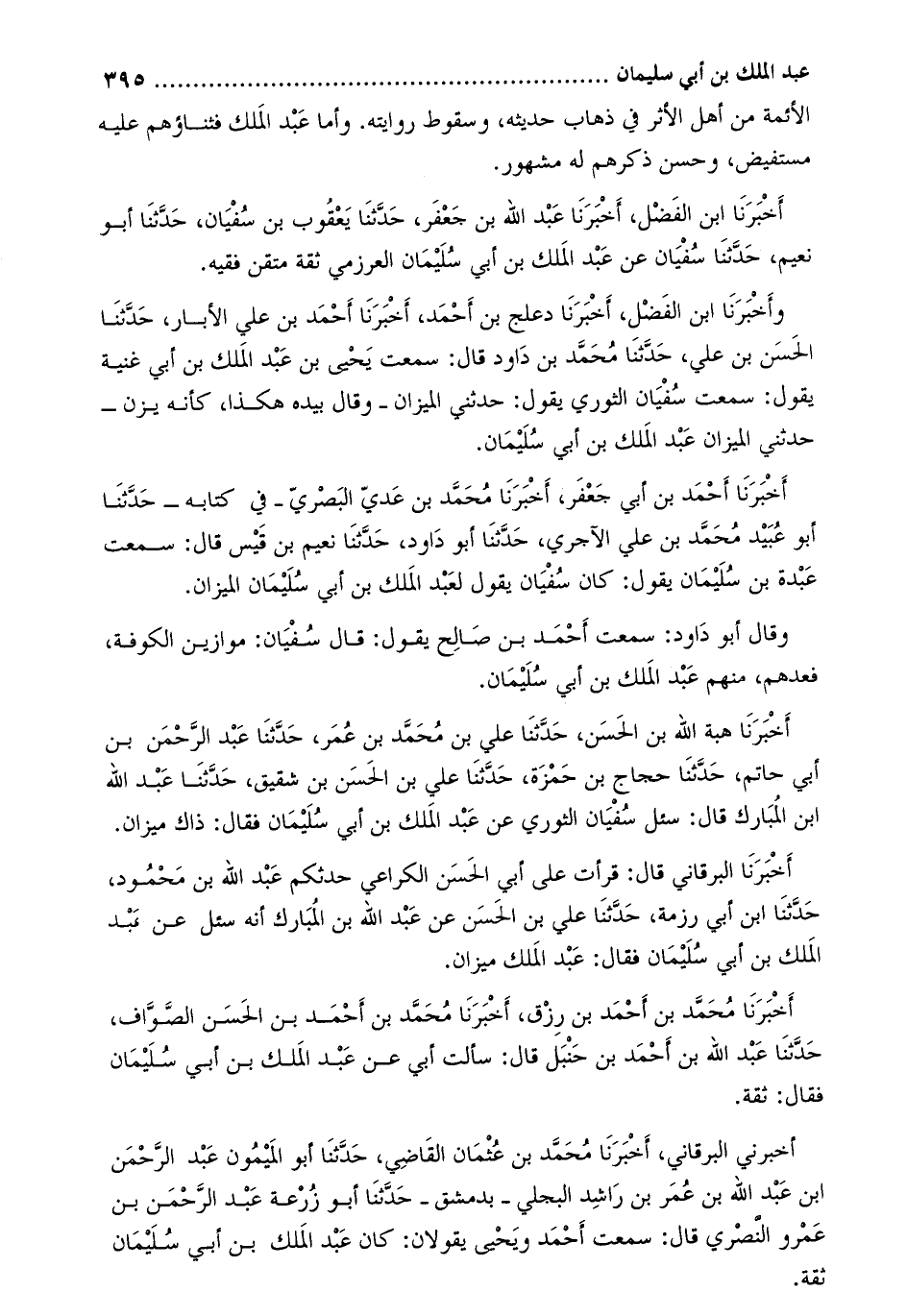 أَخْبَرَنَا ابْن الْفَضْل، أَخْبَرَنَا عَبْدُ اللَّهِ بْنُ جَعْفَرٍ، حَدَّثَنَا يعقوب بن سفيان، حدّثنا أبو نعيم، حَدَّثَنَا سفيان عن عبد الملك بن أبي سليمان العرزمي ثقة متقن فقيه.