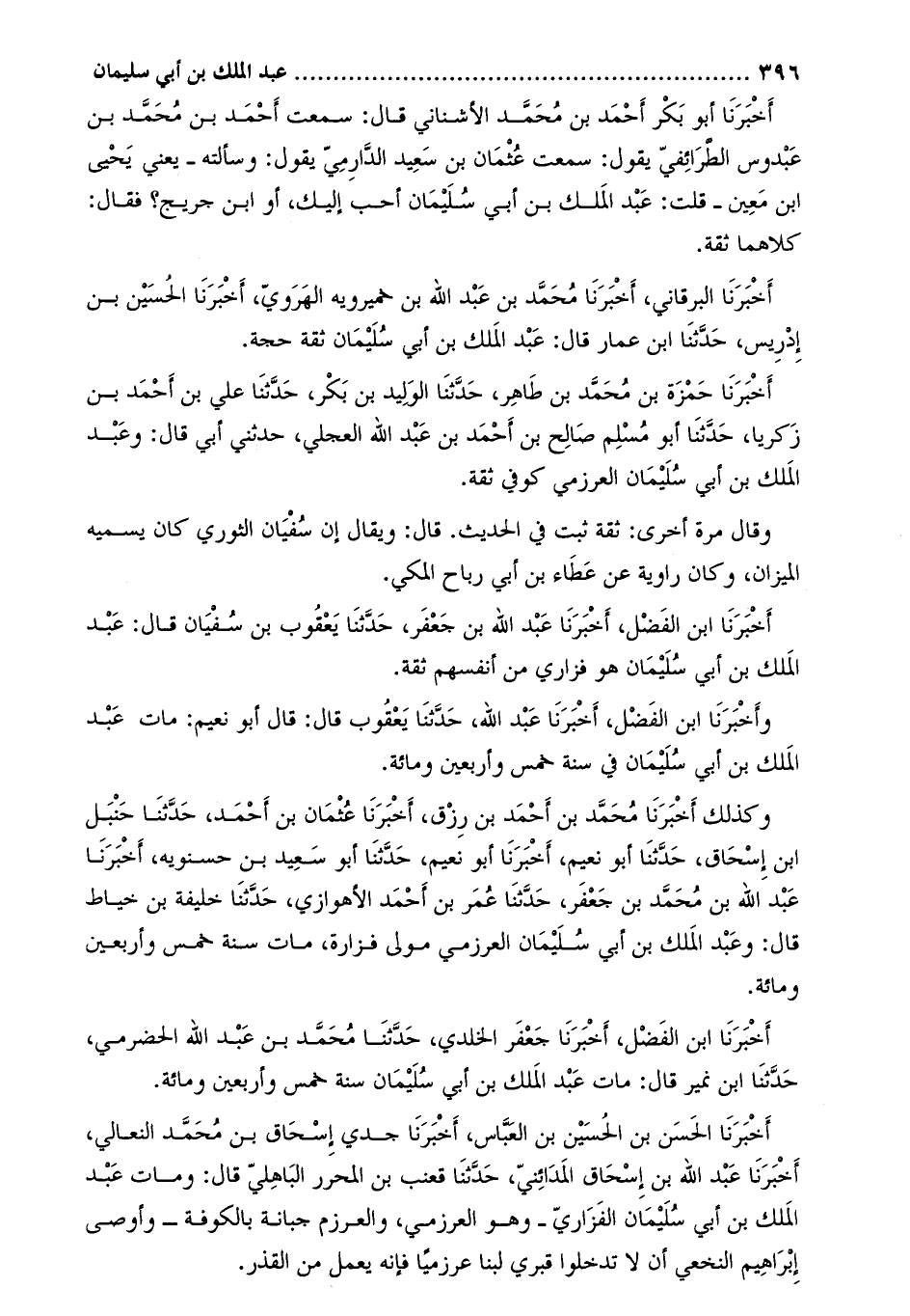 أَخْبَرَنَا حمزة بن محمّد بن طاهر، حدّثنا الوليد بن بكر، حدّثنا علي بن أحمد بن زكريا، حدثنا أبو مسلم صالح بن أحمد بن عبد الله العجلي، حَدَّثَنِي أبي قال: وعبد الملك بن أبي سليمان العرزمي كوفي ثقة.
