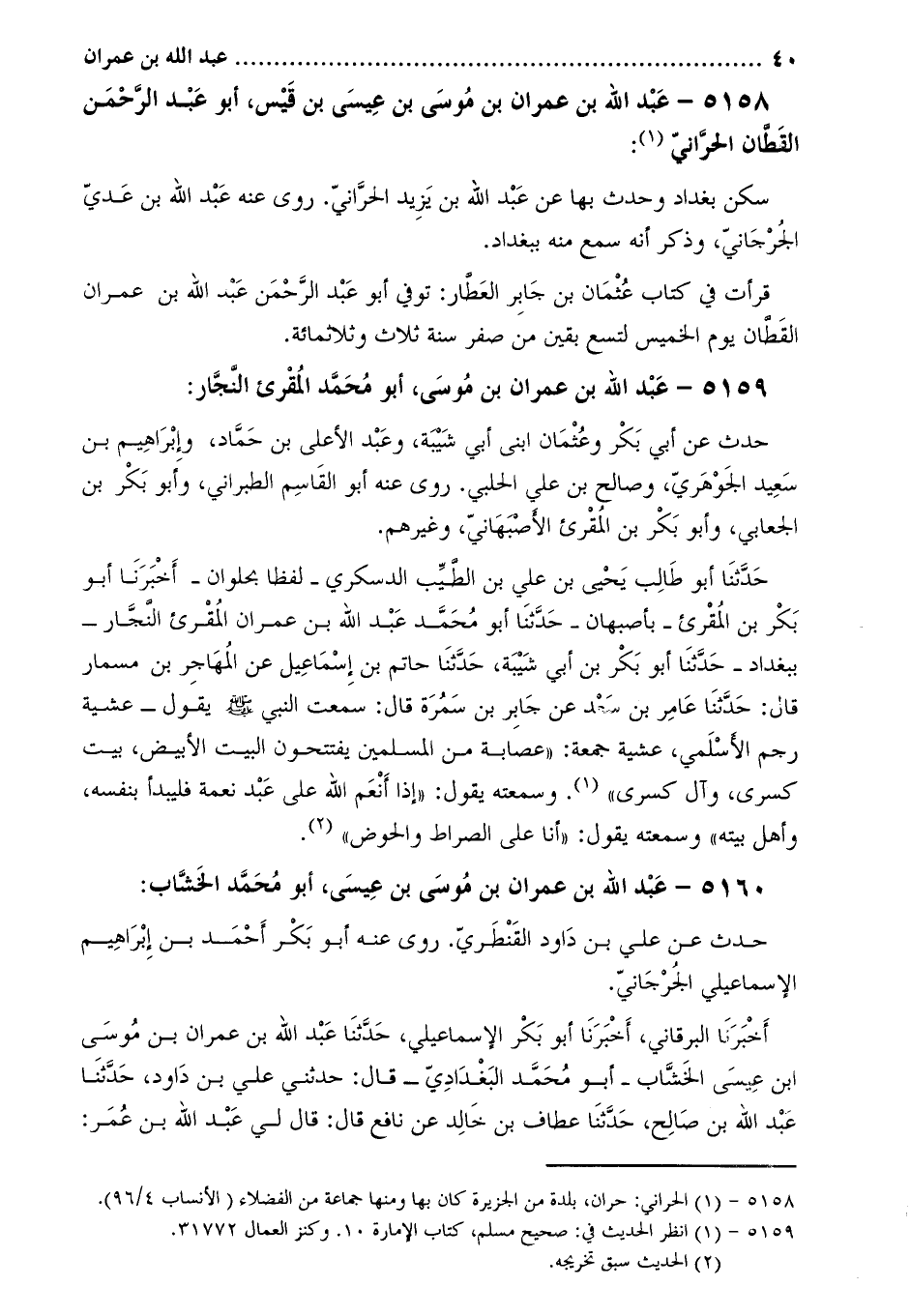 5160 عبد اللَّه بن عمران بن موسى بن عيسى، أبو مُحَمَّد الخشاب: