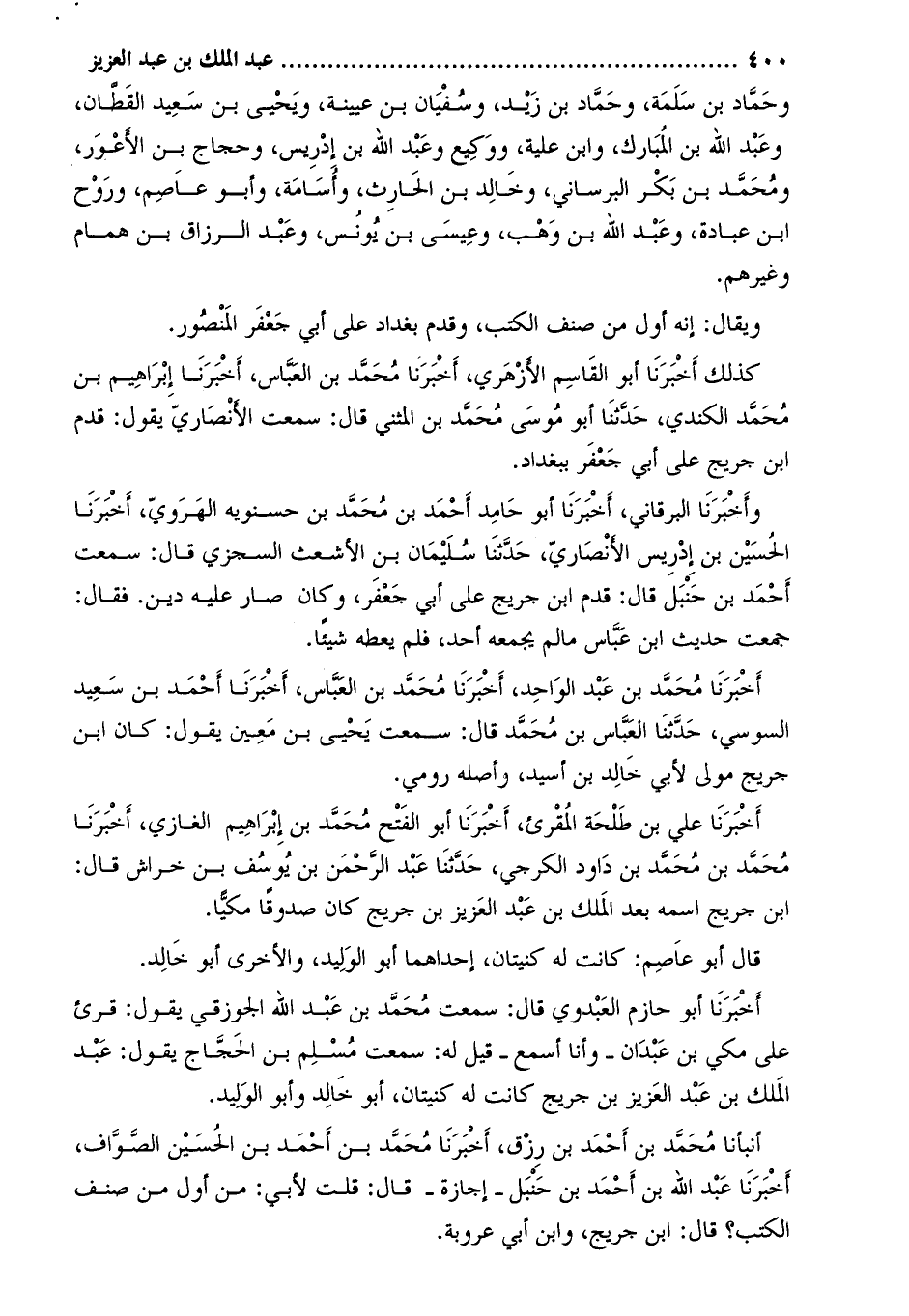 أنبأنا محمد بن أحمد بن رزق، أخبرنا محمد بن أحمد بن الحسين الصّوّاف، أخبرنا عَبْدُ اللَّهِ بْنُ أَحْمَدَ بْنِ حَنْبَلٍ- إجازة- قال: قلت لأبي: من أول من صنف الكتب؟ قال: ابن جريج، وابن أبي عروبة.