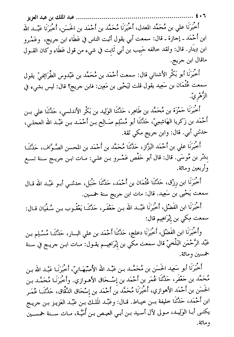 أَخْبَرَنَا أَبُو سَعِيد الْحَسَن بْن مُحَمَّد بن عبد الله الأصبهانيّ، أخبرنا عَبْدُ اللَّهِ بْنُ مُحَمَّدِ بْنِ جَعْفَرِ، حَدَّثَنَا عُمَر بْن أَحْمَد بْن إِسْحَاقَ الأهوازي. وأَخْبَرَنَا مُحَمَّد بْن الحسن بْن أَحْمَد الأهوازي، أَخْبَرَنَا محمد بن أحمد بن إسحاق الدقاق، حدّثنا عمر ابن أحمد، حَدَّثَنَا خليفة بن خياط. قال: وعَبْد الملك بْن عَبْد العزيز بْن جريج يكنى أبا الوليد، مولى لآل أسيد بن أبي العيص بن أمية، مات سنة خمسين ومائة.