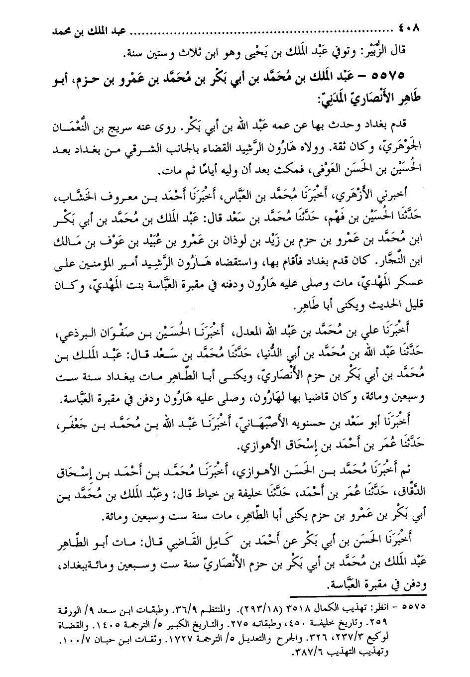 5575- عبد الملك بْن مُحَمَّد بْن أَبِي بَكْرِ بْنِ مُحَمَّدِ بْنِ عَمْرِو بن حزم، أبو طاهر الأنصاري المدني [1] :