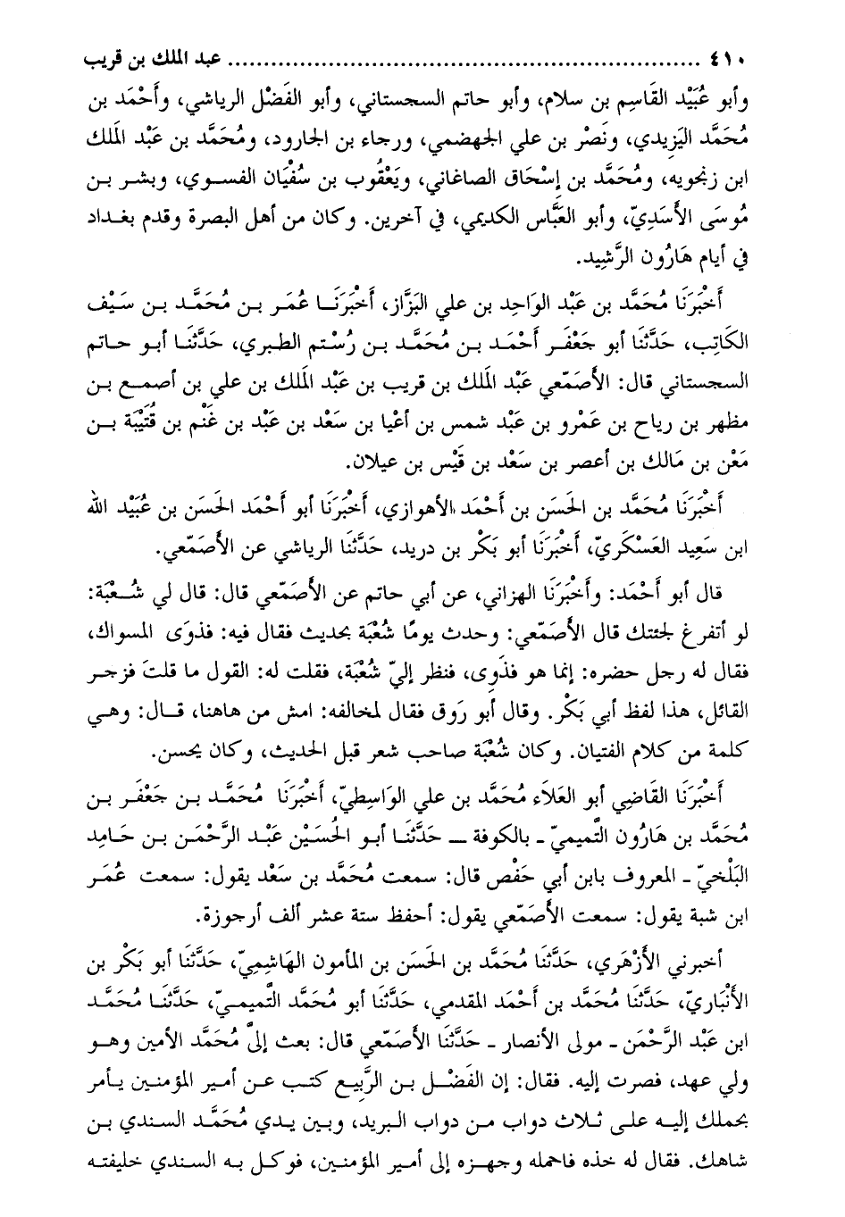 أَخْبَرَنَا القاضي أبو العلاء محمد بن علي الواسطيّ، أَخْبَرَنَا مُحَمَّد بْن جعفر بْن مُحَمَّد بْن هارون التّميميّ- بالكوفة- حَدَّثَنَا أبو الحسين عبد الرحمن بن حامد البلخي- المعروف بابن أبي حفص قال: سمعت محمّد بن سعد يقول: سمعت عمر ابن شبة يقول: سمعت الأصمعي يقول: أحفظ ستة عشر ألف أرجوزة.