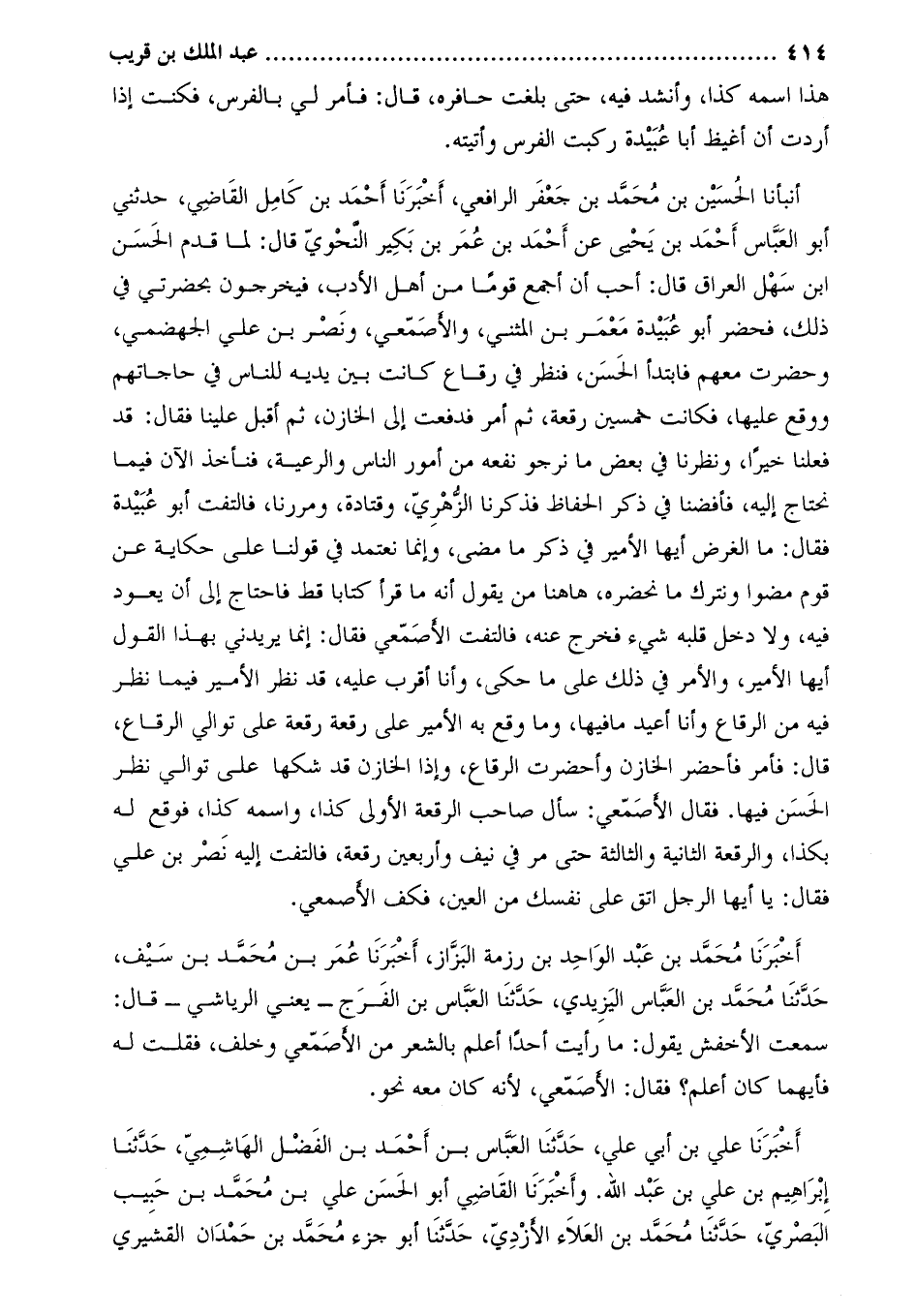 أنبأنا الحسين بن محمد بن جعفر الرافعي، أخبرنا أحمد بن كامل القاضي، حَدَّثَنِي أبو العباس أحمد بن يحيى عن أحمد بن عمر بن بكير النحوي قال: لما قدم الحسن ابن سهل العراق قال: أحب أن أجمع قوما من أهل الأدب، فيخرجون بحضرتي في ذلك، فحضر أبو عبيدة معمر بن المثنى، والأصمعي، ونصر بن علي الجهضمي، وحضرت معهم فابتدأ الحسن، فنظر في رقاع كانت بين يديه للناس في حاجاتهم ووقع عليها، فكانت خمسين رقعة، ثم أمر فدفعت إلى الخازن، ثم أقبل علينا فقال: قد فعلنا خيرا، ونظرنا في بعض ما نرجو نفعه من أمور الناس والرعية، فنأخذ الآن فيما نحتاج إليه، فأفضنا في ذكر الحفاظ فذكرنا الزهري، وقتادة، ومررنا، فالتفت أبو عبيدة فقال: ما الغرض أيها الأمير في ذكر ما مضى، وإنما نعتمد في قولنا على حكاية عن قوم مضوا ونترك ما نحضره، هاهنا من يقول أنه ما قرأ كتابا قط فاحتاج إلى أن يعود فيه، ولا دخل قلبه شيء فخرج عنه، فالتفت الأصمعي فقال: إنما يريدني بهذا القول أيُّها الأمير، والأمر في ذلك على ما حكى، وأنا أقرب عليه، قد نظر الأمير فيما نظر فيه من الرقاع وانا أعيد ما فيها، وما وقع به الأمير على رقعة رقعة على توالي الرقاع، قال: فأمر فأحضر الخازن وأحضرت الرقاع، وإذا الخازن قد شكها على توالي نظر الحسن فيها. فقال الأصمعي: سأل صاحب الرقعة الأولى كذا، واسمه كذا، فوقع له بكذا، والرقعة الثانية والثالثة حتى مر في نيف وأربعين رقعة، فالتفت إليه نصر بن علي فقال: يا أيها الرجل اتق على نفسك من العين، فكف الأصمعي.