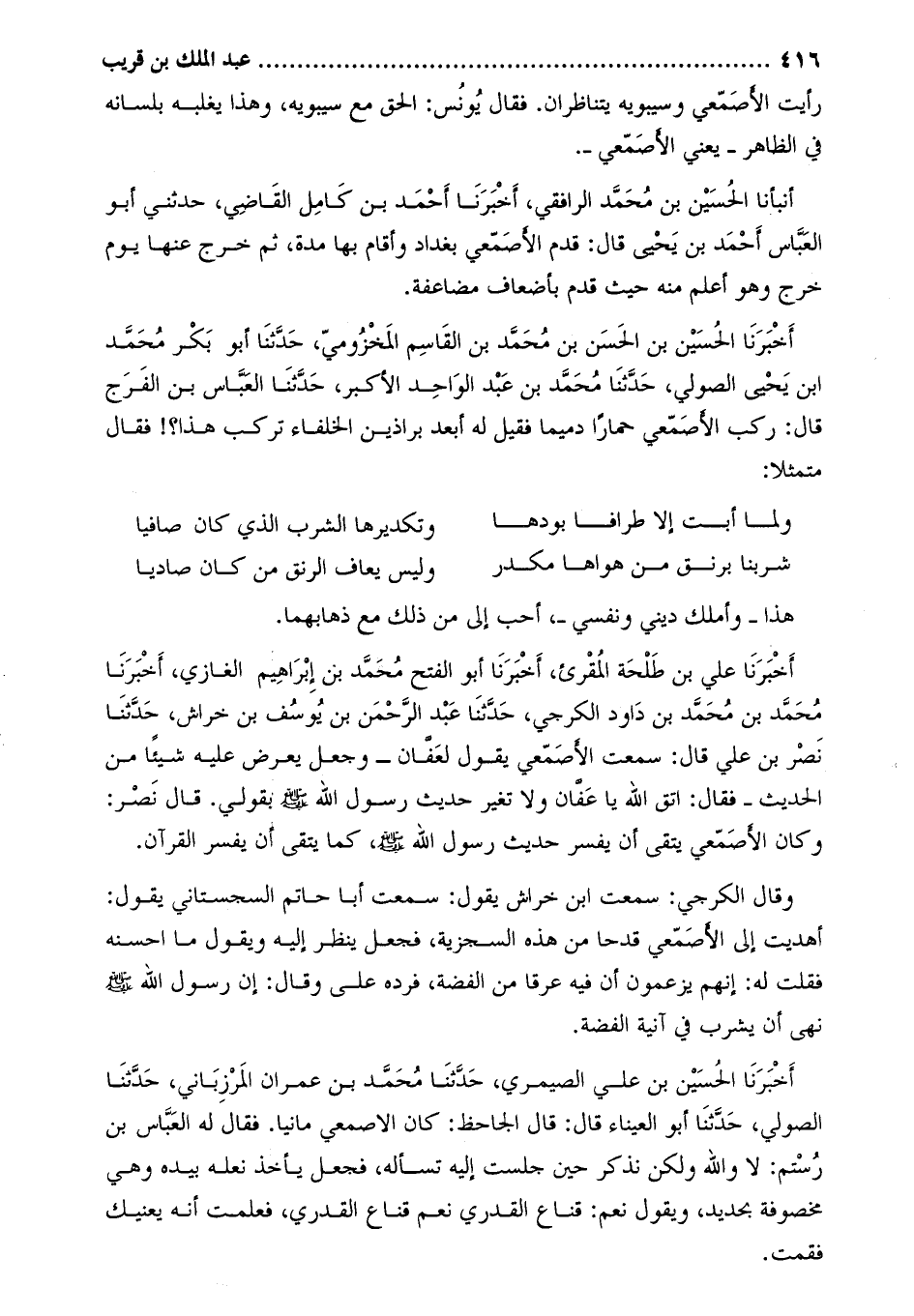 أَخْبَرَنَا الحسين بْن الحسن بْن مُحَمَّد بْن القاسم المخزوميّ، حدّثنا أبو بكر محمّد ابن يحيى الصولي، حدّثنا محمّد بن عبد الواحد الأكبر، حَدَّثَنَا العباس بن الفرج قال: ركب الأصمعي حمارا دميما فقيل له أبعد براذين الخلفاء تركب هذا؟! فقال متمثلا: