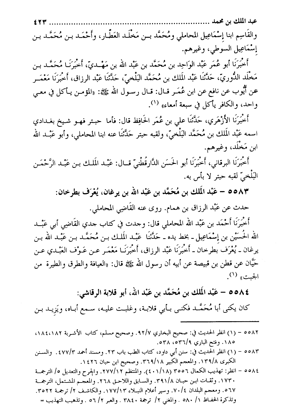 أَخْبَرَنَا أَبُو عُمَرَ عَبْدُ الْوَاحِدِ بْنُ مُحَمَّدِ بْنِ عبد الله بن مهديّ، أخبرنا محمّد بن مخلد الدّوريّ، حدّثنا عبد الملك بن محمّد البلخيّ، حدّثنا عبد الرزاق، أَخْبَرَنَا مَعْمَرٌ عَنْ أَيُّوبَ عَنْ نَافِعٍ عَنِ ابْنِ عُمَرَ قَالَ: قَالَ رَسُولُ اللَّهِ صَلَّى اللَّهُ عَلَيْهِ وَسَلَّمَ: «الْمُؤْمِنَ يَأْكُلُ فِي مِعًى وَاحِدٍ، وَالْكَافِرُ يَأْكُلُ فِي سَبْعَةِ أَمْعَاءٍ» [1] .