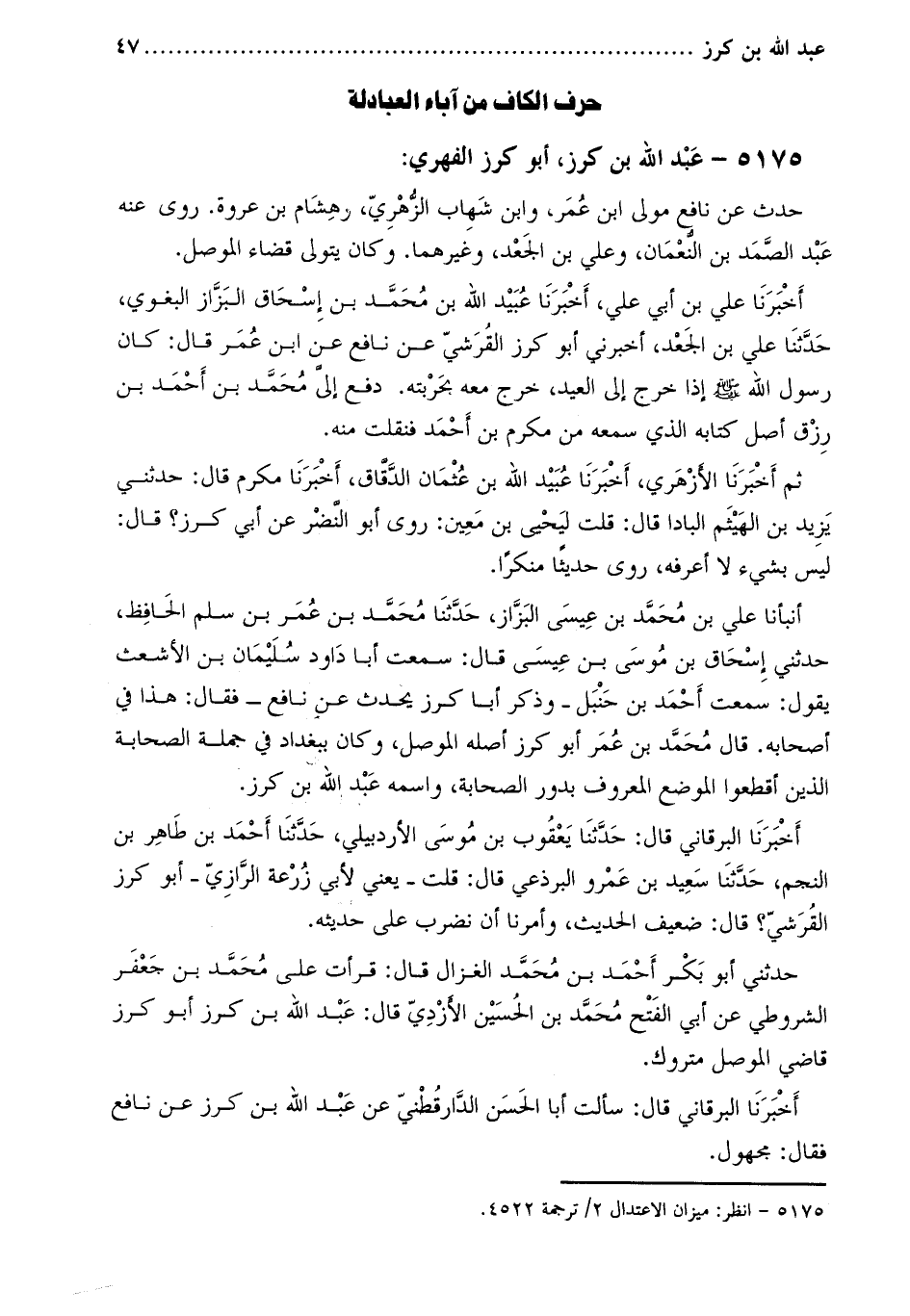 حَدَّثَنِي أَبُو بَكْر أَحْمَد بْن مُحَمَّد الغزال قَالَ: قرأت على مُحَمَّد بْن جَعْفَر الشروطي عَنْ أَبِي الْفَتْحِ مُحَمَّدِ بْنِ الْحُسَيْنِ الأَزْدِيِّ قَالَ: عبد اللَّه بن كرز أبو كرز قاضي الموصل متروك.