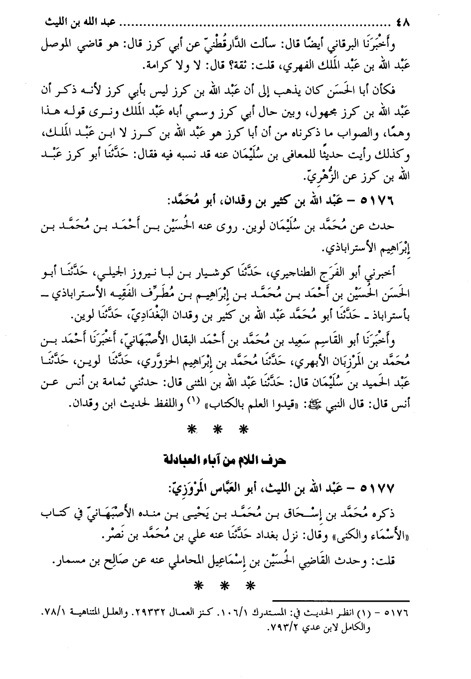 وَأَخْبَرَنَا أَبُو الْقَاسِمِ سَعِيدُ بْنُ مُحَمَّدِ بْنِ أَحْمَدَ البقال الأصبهانيّ، أَخْبَرَنَا أَحْمَدُ بْنُ مُحَمَّدِ بْنِ الْمَرْزُبَانِ الأَبْهَرِيُّ، حدّثنا محمّد بن إبراهيم الحزوّري، حدّثنا لوين، حَدَّثَنَا عَبْدُ الْحَمِيدِ بْنُ سُلَيْمَانَ قَالَ: حَدَّثَنَا عَبْدُ اللَّهِ بْنُ الْمُثَنَّى قَالَ: حَدَّثَنِي ثُمَامَةُ بْنُ أَنَسٍ عَنْ أَنَسٍ قَالَ: قَالَ النَّبِيُّ صَلَّى اللَّهُ عَلَيْهِ وَسَلَّمَ: «قَيِّدُوا الْعِلْمَ بِالْكِتَابِ» [1]