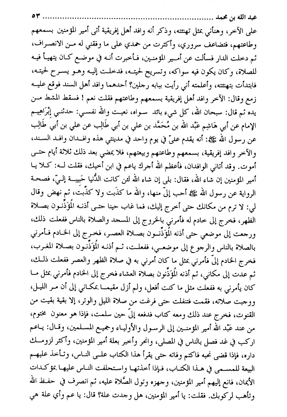 عَلَيَّ الآخَرُ، وَهَنَّأَنِي بِمِثْلِ تَهْنِئَتِهِ، وَذَكَرَ أَنَّهُ وَافِدُ أَهْلِ إِفْرِيقِيَةِ أَتَى أَمِيرَ الْمُؤْمِنِينَ بِسَمْعِهِمْ وَطَاعَتِهِمْ، فَتَضَاعَفَ سُرُورِي، وَأَكْثَرْتُ مِنْ حَمْدِي عَلَى مَا وَفَّقَنِي لَهُ مِنَ الانْصِرَافِ، ثُمَّ دَخَلْتُ الدَّارَ فَسَأَلْتُ عَنْ أَمِيرِ الْمُؤْمِنِينَ، فَأُخْبِرْتُ أَنَّهُ فِي مَوْضِعٍ كَانَ يَتَهَيَّأُ فِيهِ لِلصَّلاةِ، وَكَانَ يَكُونُ فِيهِ سِوَاكُهُ، وَتَسْرِيحُ لِحْيَتِهِ، فَدَخَلْتُ إِلَيْهِ وَهُوَ يُسَرِّحُ لِحْيَتَهُ، فَابْتَدَأْتُ بِتَهْنِئَتِهِ، وَأَعْلَمْتُهُ أَنِّي رَأَيْتُ بِبَابِهِ رَجُلَيْنِ؟ أَحَدَهُمَا وَافِدَ أَهْلِ السّنَدِ فَوَقَعَ عَلَيْهِ زَمْعٌ وَقَالَ: الآخَرَ وَافِدَ أَهْلِ إِفْرِيقِيَةِ بِسَمْعِهِمْ وَطَاعَتِهِمْ فَقُلْتُ نَعَمْ! فَسَقَطَ الْمُشْطُ مِنْ يَدِهِ ثُمَّ قَالَ: سُبْحَانَ اللَّهِ، كُلُّ شَيْءٍ بَائِدٌ سِوَاهُ، نَعَيْتُ وَاللَّهِ نَفْسِي: حَدَّثَنِي إبْرَاهِيمُ الإِمَامُ عَنْ أَبِي هَاشِمٍ عَبْد اللَّه بْن مُحَمَّد بْن عَلِيِّ بْن أَبِي طَالِبٍ عَنْ عَلِيِّ بْنِ أَبِي طَالِبٍ عَنْ رَسُولِ اللَّهِ صَلَّى اللَّهُ عَلَيْهِ وَسَلَّمَ: أَنَّهُ يَقْدُمُ عَلَيَّ فِي يَوْمٍ وَاحِدٍ فِي مَدِينَتِي هَذِهِ وَافِدَانِ وَافِدُ السَّنَدِ، وَالآخَرُ وَافِدُ إِفْرِيقِيَةِ، بِسَمْعِهِمْ وَطَاعَتِهِمْ وَبَيْعَتِهِمْ، فَلا يَمْضِي بَعْدَ ذَلِكَ ثَلَاثَةُ أَيَّامٍ حَتَّى أَمُوتَ. وَقَدْ أَتَانِي الْوَافِدَانِ، فَأَعْظَمَ اللَّهُ أَجْرَكَ يَا عَمِّ فِي ابْنِ أَخِيكَ، فَقُلْتُ لَهُ: كَلا يَا أَمِيرَ الْمُؤْمِنِينَ إِنْ شَاءَ اللَّهُ، فَقَالَ: بَلَى إِنْ شَاءَ اللَّهُ لَئِنْ كَانَتِ الدُّنْيَا حَبِيبَةً إِلَيَّ، فَصِحَّةُ الرِّوَايَةِ عَنْ رَسُولِ اللَّهِ صَلَّى اللَّهُ عَلَيْهِ وَسَلَّمَ أَحَبَّ إِلَيَّ مِنْهَا، وَاللَّهِ مَا كَذَبْتُ وَلا كُذِبْتُ، ثُمَّ نَهَضَ وَقَالَ لِي: لا تَرِمْ مِنْ مَكَانِكَ حَتَّى أَخْرُجَ إِلَيْكَ، فَمَا غَابَ حِينًا حَتَّى أَذَّنَهُ الْمُؤَذِّنُونَ بِصَلاةِ الظُّهْرِ، فَخَرَجَ إِلَيَّ خَادِمٌ لَهُ فَأَمَرَنِي بِالْخُرُوجِ إِلَى الْمَسْجِدِ وَالصَّلاةِ بِالنَّاسِ فَفَعَلْتُ ذَلِكَ، وَرَجَعْتُ إِلَى مَوْضِعِي حَتَّى آذَنَهُ الْمُؤَذِّنُونَ بِصَلاةِ الْعَصْرِ، فَخَرَجَ إِلَيَّ الْخَادِمِ فَأَمَرَنِي بِالصَّلاةِ بِالنَّاسِ وَالرُّجُوعِ إِلَى مَوْضِعِي، فَفَعَلْتُ، ثُمَّ آذَنَهُ الْمُؤَذِّنُونَ بِصَلاةِ الْمَغْرِبِ، فَخَرَجَ الْخَادِمُ إِلَيَّ فَأَمَرَنِي بِمِثْلِ مَا كَانَ أَمَرَنِي بِهِ فِي صَلاةِ الظُّهْرِ وَالْعَصْرِ فَفَعَلْتُ ذَلِكَ، ثُمَّ عُدْتُ إِلَى مَكَانِي، ثُمَّ آذَنَهُ الْمُؤَذِّنُونَ بِصَلاةِ الْعِشَاءِ فَخَرَجَ إِلَى الْخَادِمِ فَأَمَرَنِي بِمِثْلِ مَا كَانَ يَأْمُرُنِي بِهِ فَفَعَلْتُ مِثْلَ مَا كُنْتُ أَفْعَلُ، وَلَمْ أَزَلْ مُقِيمًا بِمَكَانِي إِلَى أَنْ مَرَّ اللَّيْلُ، وَوَجَبَتْ صَلاتُهُ، فَقُمْتُ فَتَنَفَّلْتُ حَتَّى فَرَغْتُ مِنْ صَلاةِ اللَّيْلِ وَالْوِتْرِ، إِلا بَقِيَّةً بَقِيَتْ مِنَ الْقُنُوتِ، فَخَرَجَ عِنْدَ ذَلِكَ وَمَعَهُ كِتَابٌ فَدَفَعَهُ إِلَيَّ حِينَ سَلَّمْتُ، فَإِذَا هُوَ مُعَنْوَنٌ مَخْتُومٌ، مِنْ عِنْدِ عَبْدِ اللَّهِ أَمِيرِ الْمُؤْمِنِينَ إِلَى الرَّسُولِ وَالأَوْلِيَاءِ وَجَمِيعِ الْمُسْلِمِينَ، وَقَالَ: يَا عَمِّ ارْكَبْ فِي غَدٍ فَصَلِّ بِالنَّاسِ فِي الْمُصَلَّى، وَانْحَرْ وَأَخْبِرْ بِعِلَّةِ أَمِيرِ الْمُؤْمِنِينَ، وَأَكْثِرْ لُزُومَكَ دَارَهُ، فَإِذَا قَضَى نَحْبَهُ فَاكْتُمْ وَفَاتَهُ حَتَّى يُقْرَأَ هَذَا الْكِتَابُ عَلَى النَّاسِ، وَتَأْخُذَ عَلَيْهِمُ الْبَيْعَةَ لِلْمُسَمَّى فِي هَ