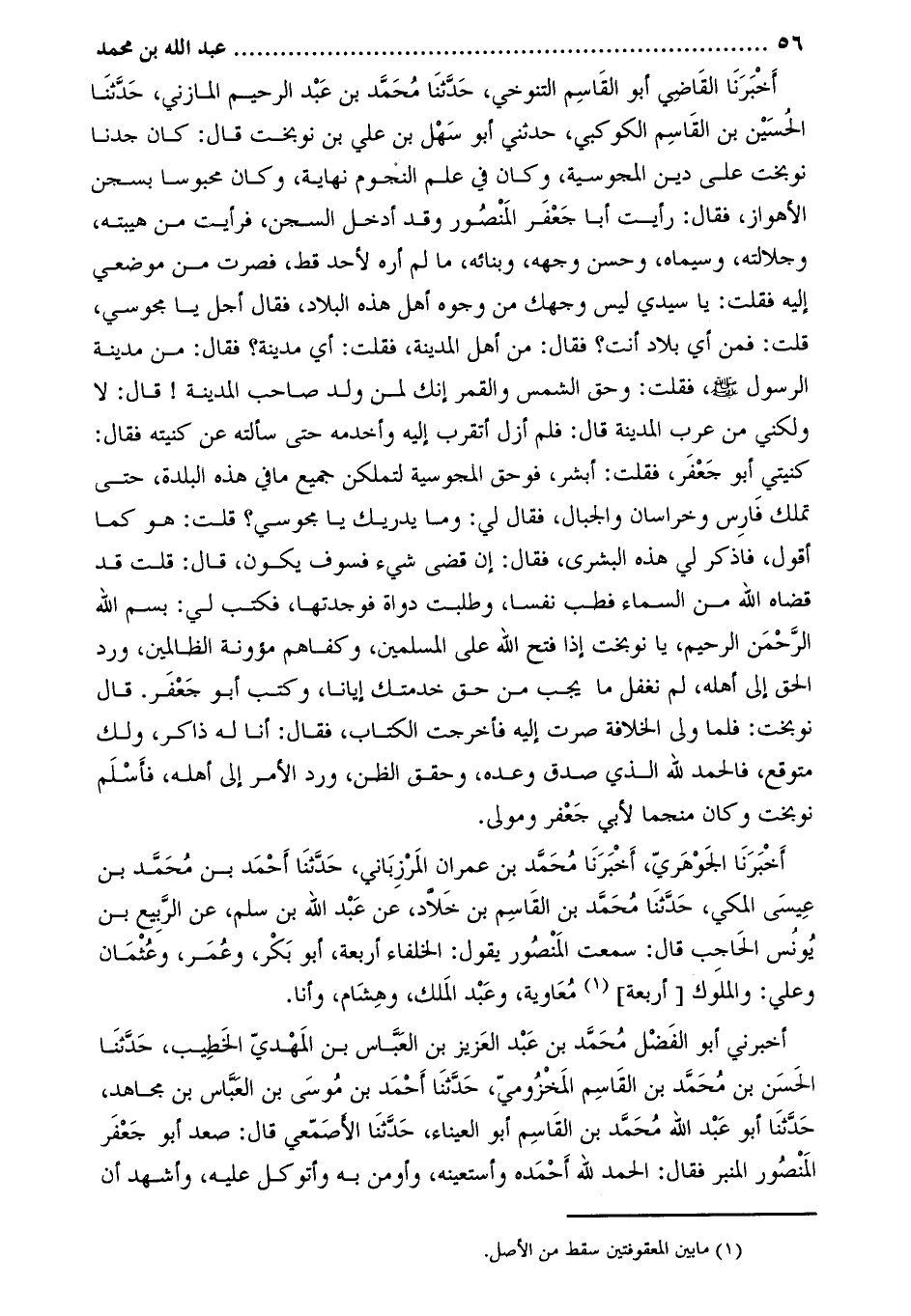 أَخْبَرَنِي أَبُو الفضل مُحَمَّد بْن عَبْد العزيز بن العبّاس بن المهديّ الخطيب، حَدَّثَنَا الْحَسَن بن مُحَمَّد بن القاسم المخزومي، حَدَّثَنَا أَحْمَدُ بْنُ مُوسَى بْنِ الْعَبَّاسِ بْنِ مُجَاهِدٍ، حَدَّثَنَا أَبُو عَبْدِ اللَّهِ مُحَمَّدُ بْنُ الْقَاسِمِ أبو العيناء، حَدَّثَنَا الأصمعي قَالَ: صعد أبو جعفر المنصور المنبر فقَالَ: الْحَمْدُ لِلَّهِ أَحْمَده وَأَسْتَعِينُهُ، وَأُومِنُ بِهِ وَأَتَوَكَّلُ عليه، وأشهد أن