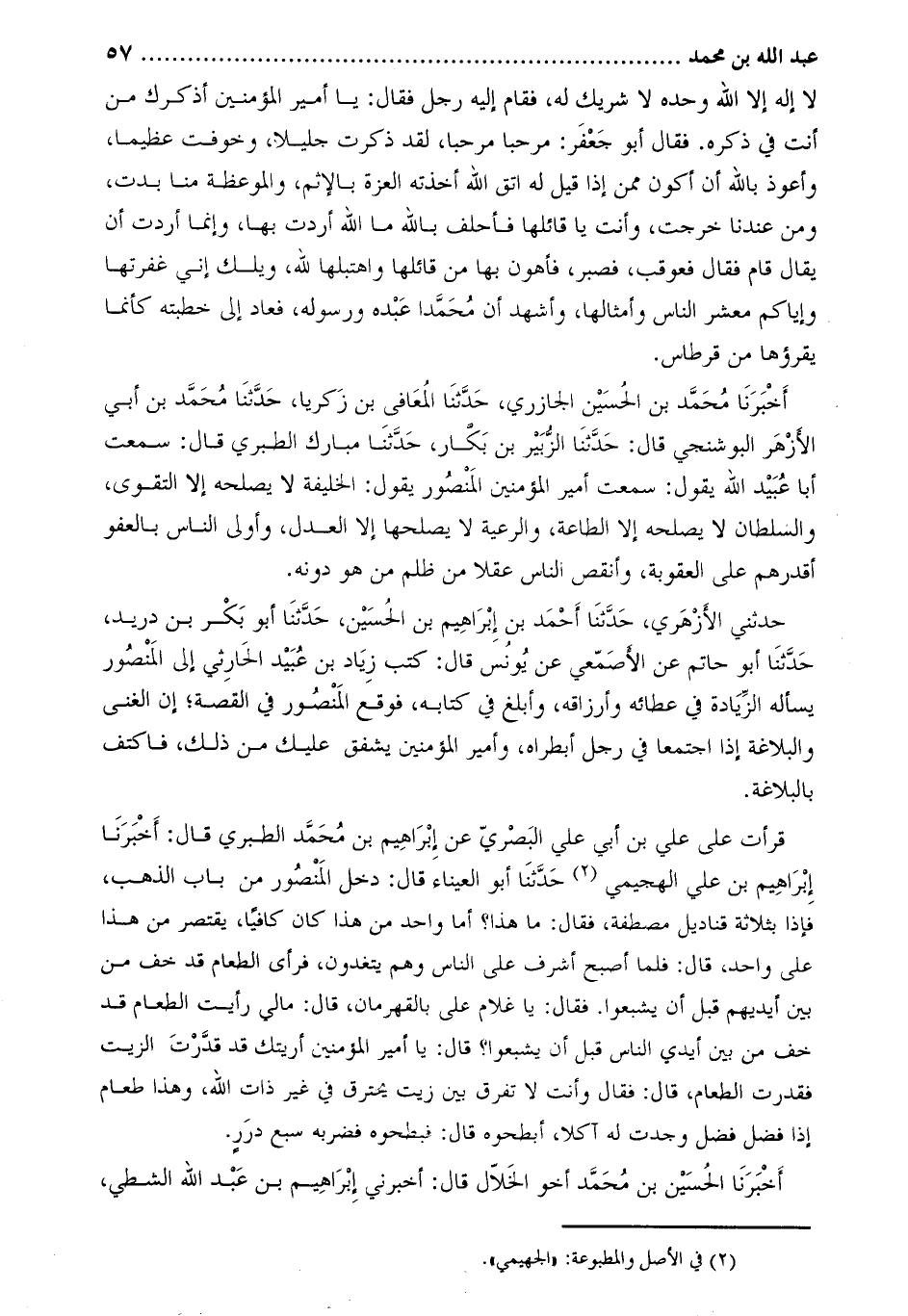 أَخْبَرَنَا محمد بن الحسين الجازري، حدّثنا المعافى بن زكريا، حَدَّثَنَا مُحَمَّد بن أبي الأزهر البوشنجي قَالَ: حدّثنا الزّبير بن بكّار، حَدَّثَنَا مبارك الطبري قَالَ: سمعت أبا عبيد اللَّه يَقُول: سمعت أمير المؤمنين المنصور يَقُول: الخليفة لا يصلحه إلا التقوى، والسلطان لا يصلحه إلا الطاعة، والرعية لا يصلحها إلا العدل، وأولى الناس بالعفو أقدرهم على العقوبة، وأنقص الناس عقلًا من ظلم من هو دونه.