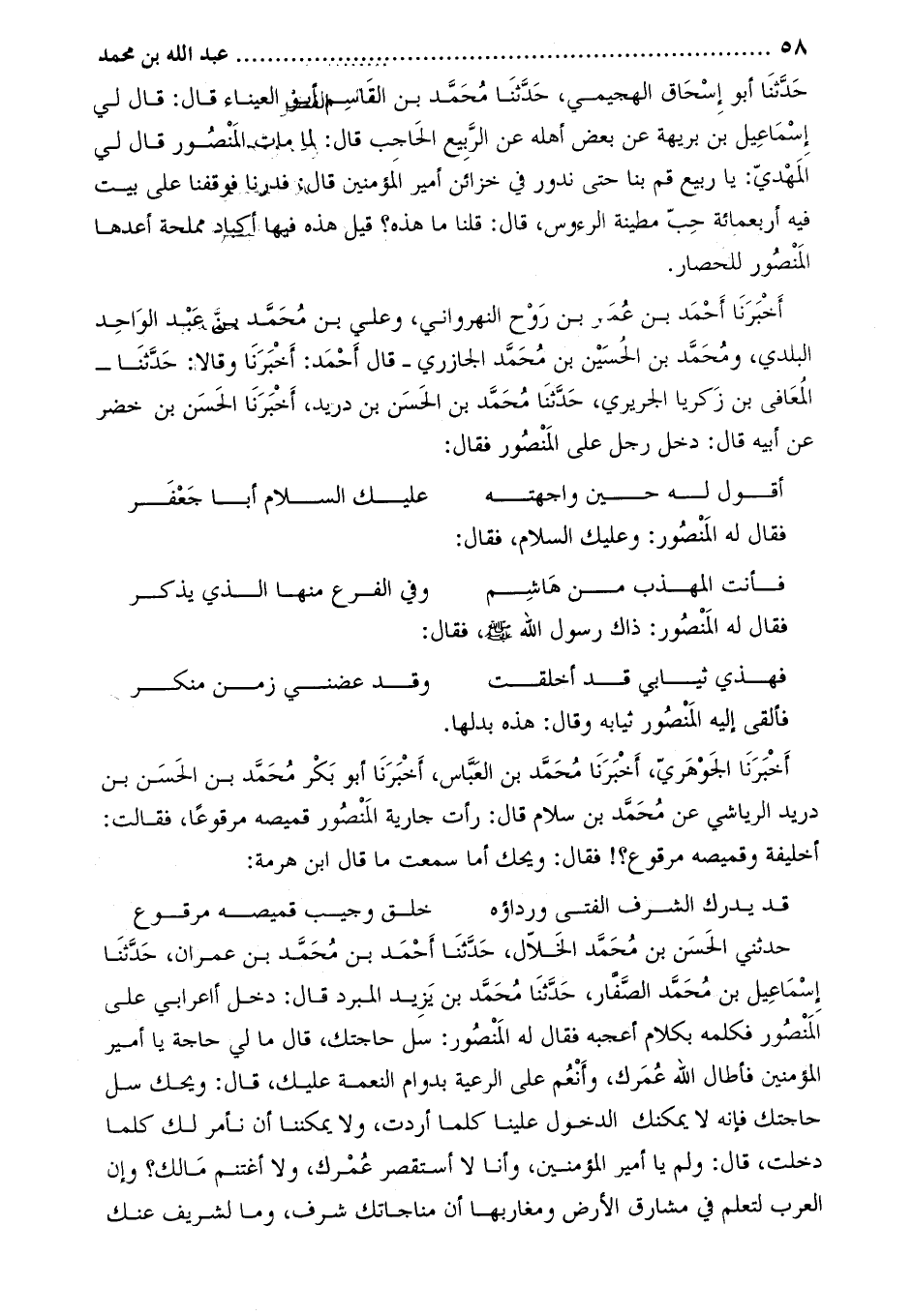 أَخْبَرَنَا أَحْمَد بن عمر بن روح النهرواني، وعَلِيُّ بْنُ مُحَمَّدِ بْنِ عَبْدِ الْوَاحِدِ الْبَلَدِيُّ، ومُحَمَّد بْن الْحُسَيْن بْن مُحَمَّد الجازري- قَالَ أَحْمَد: أَخْبَرَنَا وقَالَا: حَدَّثَنَا- المعافى بن زكريا الجريري، حدّثنا محمّد بن الحسن بن دريد، أَخْبَرَنَا الْحَسَن بن خضر عَنْ أَبِيهِ قَالَ: دخل رجل على المنصور فقَالَ: