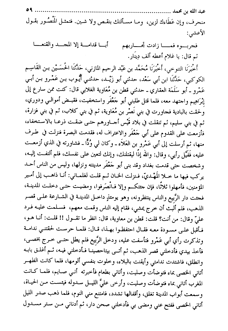 أخبرنا التنوخي، أخبرنا محمّد بن عبد الرحيم المازني، حدّثنا الحسين بن القاسم الكوكبي، حدّثنا ابن أبي سعد، حدّثني أبو زيد، حَدَّثَنِي أيوب بن عمرو بن أَبِي عمرو- أبو سلمة العقاري- حَدَّثَنِي قطن بن معاوية الغلابي قَالَ: كنت مِمن سارع إلى إِبْرَاهِيم واجتهد معه، فلما قتل طلبني أبو جعفر واستخفيت، فقبض أموالي ودوري، ولحقت بالبادية فجاورت في بني نصر بن معاوية، ثم في بني كلاب، ثم في بني فزارة، ثم في بني سليم، ثم تنقلت في بلاد قيس أجاورهم حتى ضقت ذرعًا بالاستخفاء، فأزمعت على القدوم على أَبِي جعفر والاعتراف له، فقدمت البصرة فنزلت في طرف منها، ثم أرسلت إلى أَبِي عمرو بن العلاء- وكان لي ودا- فشاورته في الذي أزمعت عليه، فَفَيَّل رأيي، وقَالَ: واللَّه إذا ليقتلنك، وإنك لتعين على نفسك، فلم ألتفت إليه، وشخصت حتى قدمت بغداد وقد بني أبو جعفر مدينته ونزلها، وليس من الناس أحد يركب فيها ما خلا المهدي، فنزلت الخان ثم قلت لغلماني: أنا ذاهب إلى أمير المؤمنين، فأمهلوا ثلاثًا، فإن جئتكم وإلا فانصرفوا، ومضيت حتى دخلت المدينة، فجئت دار الربيع والناس ينتظرونه، وهو يومئذ داخل المدينة في الشارعة على قصر الذهب، فلم ألبث أن خرج يمشي، فقام إليه الناس وقمت معهم، فسلمت عليه فرد علي وقَالَ: من أنت؟ قلت: قطن بن معاوية، قَالَ: انظر ما تقول!! قلت: أنا هو، فأقبل على مسودة معه فقال احتفظوا بهذا، قال: فلما حرست لحقتني ندامة وتذكرت رأي أَبِي عمرو فتأسفت عليه، ودخل الربيع فلم يطل حتى خرج بخصي، فأخذ بيدي فأدخلني قصر الذهب، ثم أتى بيتًا حصينًا فأدخلني فيه، ثم أغلق بابه وانطلق، فاشتدت ندامتي وأيقنت بالبلاء، وخلوت بنفسي ألومها، فلما كانت الظهر أتاني الخصي بماء فتوضأت وصليت، وأتاني بطعام فأخبرته أني صائم، فلما كانت المغرب أتاني بماء فتوضأت وصليت، وأرخى علي الليل سدوله فيئست من الحياة، وسمعت أبواب المدينة تغلق، وأقفالها تشدد، فامتنع مني النوم، فلما ذهب صدر الليل أتاني الخصي ففتح عني ومضى بي فأدخلني صحن دار، ثم أدناني من ستر مسدول