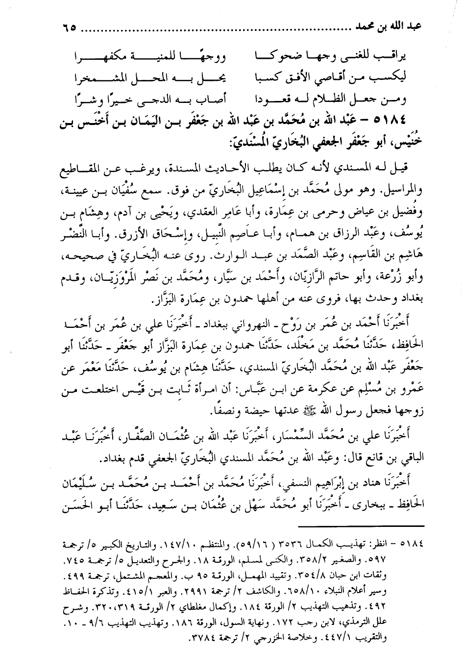 5184 عَبْد اللَّه بْن مُحَمَّد بْن عَبْد اللَّه بن جعفر بن اليمان بن أخنس بن خنيس، أبو جعفر الجعفي البخاري المسندي [1] :