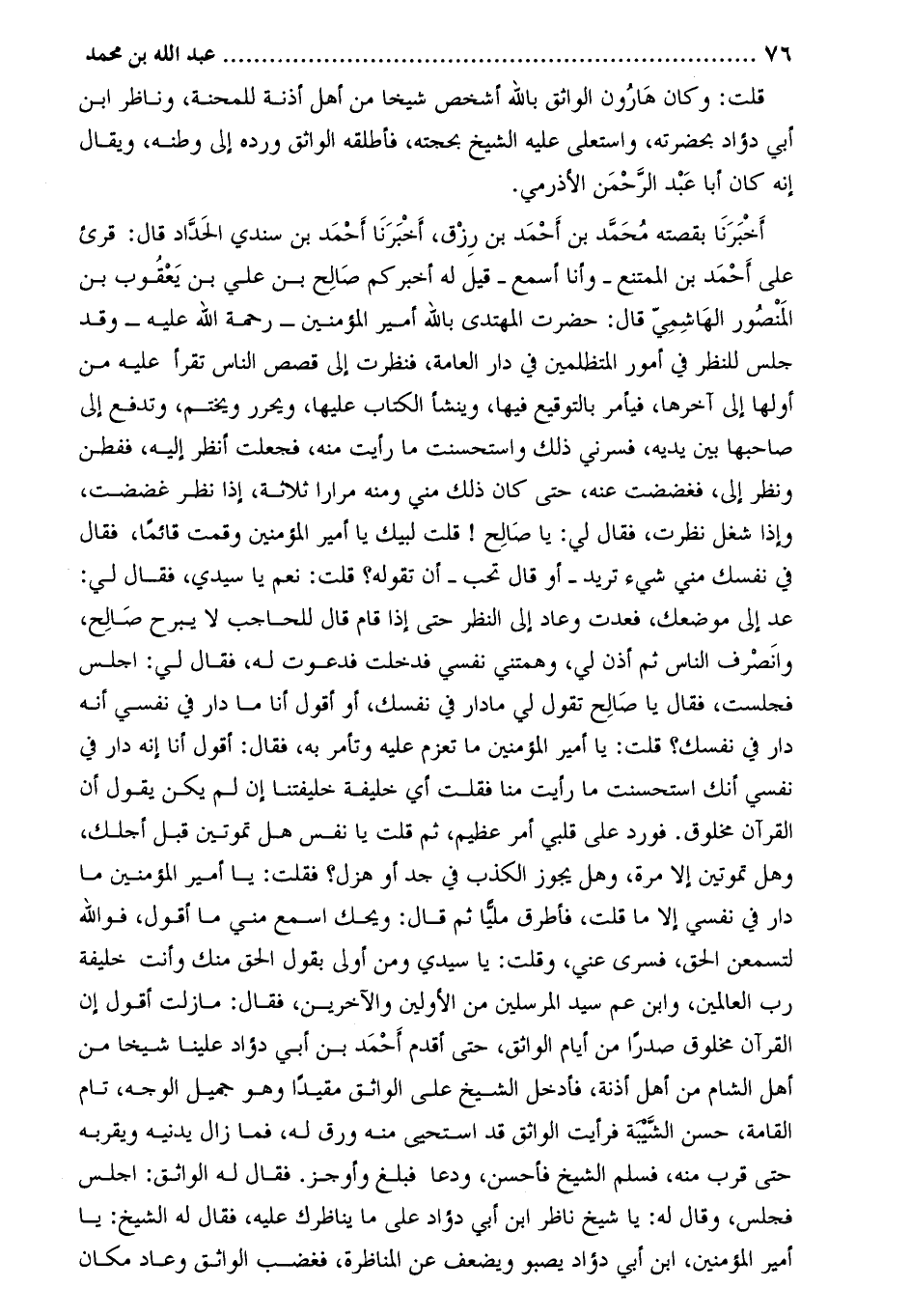 عد إلى موضعك، فعدت وعاد إلى النظر حتى إذا قام قَالَ للحاجب لا يبرح صالح، وانصرف الناس ثم أذن لي، وهمتني نفسي فدخلت فدعوت له، فقَالَ لي: اجلس فجلست، فَقَال يا صالح تقول لي ما دار في نفسك، أو أقول أنا ما دار في نفسي أَنَّهُ دار في نفسك؟ قلت: يا أمير المؤمنين ما تعزم عليه وتأمر به، فَقَالَ: أقول أنا إنه دار في نفسي أنك استحسنت ما رأيت منا فقلت أي خليفة خليفتنا إن لم يكن يَقُول إن القرآن مخلوق. فورد على قلبي أمر عظيم، ثم قلت يا نفس هل تموتين قبل أجلك، وهل تموتين إلا مرة، وهل يجوز الكذب في جد أو هزل؟ فقلت: يا أمير المؤمنين ما دار في نفسي إلا ما قلت، فأطرق مليًا ثم قَالَ: ويحك اسمع مني ما أقول، فو الله لتسمعن الحق، فسري عني، وقلت: يا سيدي ومن أولى بقول الحق منك وأنت خليفة رب العالمين، وابن عم سيد المرسلين من الأولين والآخرين، فَقَال: ما زلت أقول إن القرآن مخلوق صدرًا من أيام الواثق، حتى أقدم أَحْمَد بن أبي دؤاد علينا شيخًا من أهل الشام من أهل أذنة، فأدخل الشيخ على الواثق مقيدًا وهو جميل الوجه، تام القامة، حسن الشيبة فرأيت الواثق قد استحيا منه ورق له، فما زال يدنيه ويقربه حتى قرب منه، فسلم الشيخ فأحسن، ودعا فبلغ وأوجز. فقَالَ له الواثق: اجلس فجلس، وقال له: يا شيخ ناظر ابن أَبِي دؤاد على ما يناظرك عليه، فقَالَ له الشيخ: يا أمير المؤمنين، ابن أَبِي دؤاد يصبو ويضعف عن المناظرة، فغضب الواثق وعاد مكان