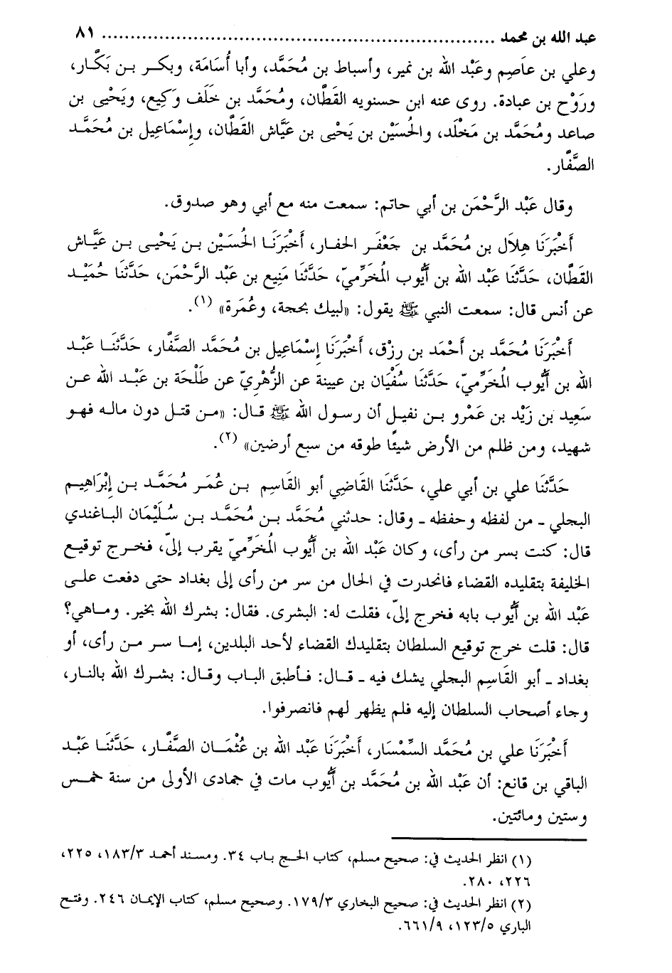 حَدَّثَنَا علي بن أبي علي، حدّثنا القاضي أبو القاسم بن عمر مُحَمَّد بْنُ إِبْرَاهِيمَ البجلي- من لفظه وحفظه- وقَالَ: حَدَّثَنِي مُحَمَّد بن مُحَمَّدِ بْنِ سُلَيْمَان الباغندي قَالَ: كنت بسر من رأى، وكان عبد اللَّه بن أيوب المخرمي يقرب إلي، فخرج توقيع الخليفة بتقليده القضاء فانحدرت في الحال من سر من رأى إلى بغداد حتى دفعت على عبد اللَّه بن أيوب بابه فخرج إلي، فقلت له: البشرى. فَقَال: بشرك اللَّه بخير. وما هي؟