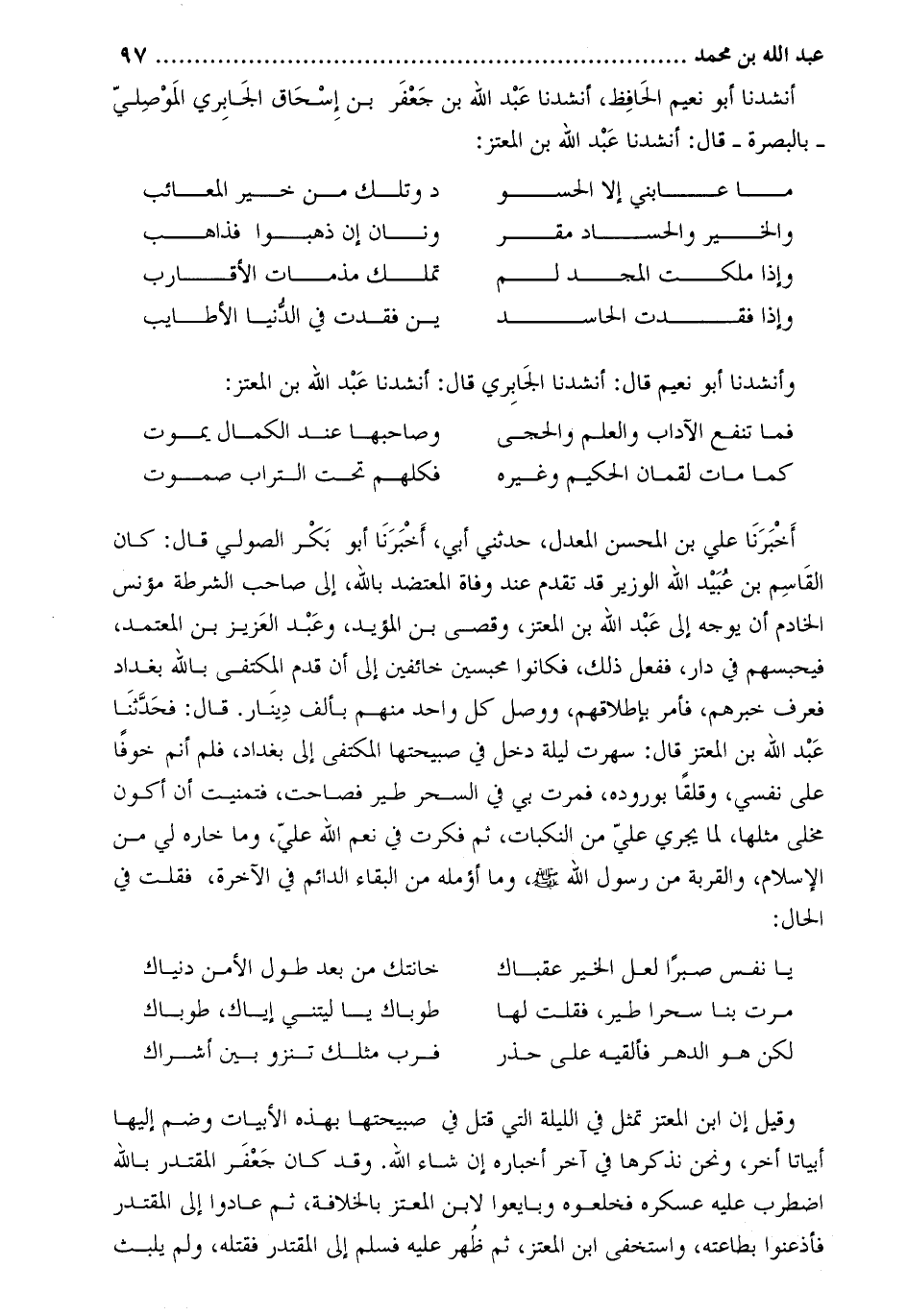أنشدنا أبو نعيم الحافظ، أنشدنا عبد اللَّه بن جعفر بن إسحاق الجابري الموصلي- بالبصرة- قَالَ: أنشدنا عبد اللَّه بن المعتز: