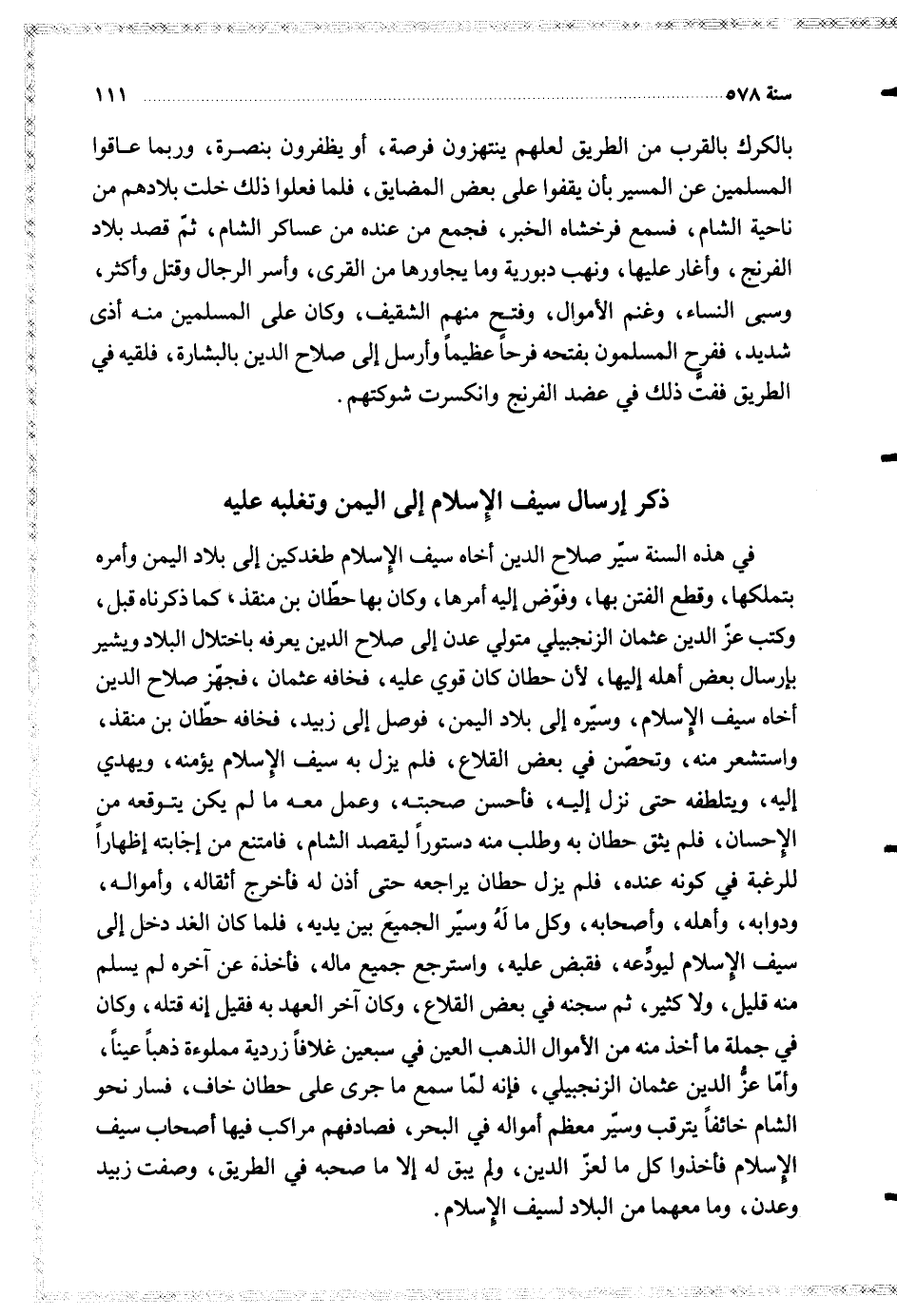في هذه السنة سير صلاح الدين أخاه سيف الإسلام طغدكين إلى بلاد اليمن وأمره بتملكها وقطع الفتن بها وفوض إليه أمرها وكان بها حطان بن منقذ كما ذكرناه قبل وكتب عز الدين عثمان الزنجبيلي متولي عدن إلى صلاح الدين يعرفه باختلال البلاد ويشير بإرسال بعض أهله اليها لأن حطان كان قوي عليه فخافه عثمان فجهز صلاح الدين أخاه سيف الإسلام وسيره إلى بلاد اليمن فوصل إلى زبيد فخافه حطان بن منقذ واستشعر منه وتحصن في بعض القلاع فلم يزل به سيف الإسلام يؤمنه ويهدي إليه ويتلطفه حتى نزل إليه فأحسن صحبته وعمل معه ما لم يكن يتوقعه من الإحسان فلم يثق حطان به وطلب منه دستورا ليقصد الشام فامتنع من إجابته إظهارا للرغبة في كونه عنده فلم يزل حطان يراجعه حتى أذن له فأخرج أثقاله وأمواله ودوابه وأهله وأصحابه وكل ما له وسير الجميع بين يديه فلما كان الغد دخل إلى سيف الإسلام ليودعه فقبض عليه واسترجع جميع ماله فأخذه عن آخره لم يسلم منه قليل ولا كثير ثم سجنه في بعض القلاع وكان آخر العهد به فقيل إنه قتله وكان في جملة ما أخذ منه من الأموال الذهب العين في سبعين غلافا زردية مملوءة ذهبا عينا وأما عز الدين عثمان الزنجبيلي فإنه لما سمع ما جرى على حطان خاف فسار نحو الشام خائفا يترقب وسير معظم أمواله في البحر فصادفهم مراكب فيها أصحاب سيف الإسلام فأخذوا كل ما لعز الدين ولم يبق له إلا ما صحبه في الطريق وصفت زبيد وعدن وما معهما من البلاد لسيف الإسلام