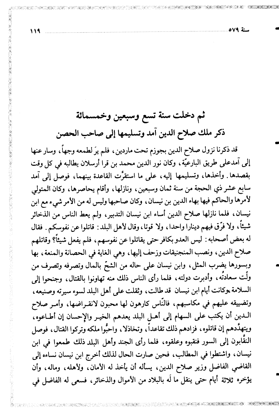وأخذها وتسليمها إليه على ما استقرت القاعدة بينهما فوصل إلى آمد سابع عشر ذي الحجة من سنة ثمان وسبعين ونازلها وأقام يحاصرها وكان المتولي لأمرها والحاكم فيها بهاء الدين بن نيسان وكان صاحبها وليس له من الأمر شيء مع ابن نيسان فلما نازلها صلاح الدين أساء ابن نيسان التدبير ولم يعط الناس من الذخائر شيئا ولا فرق فيهم دينارا واحدا ولا قوتا وقال لأهل البلد قاتلوا عن نفوسكم