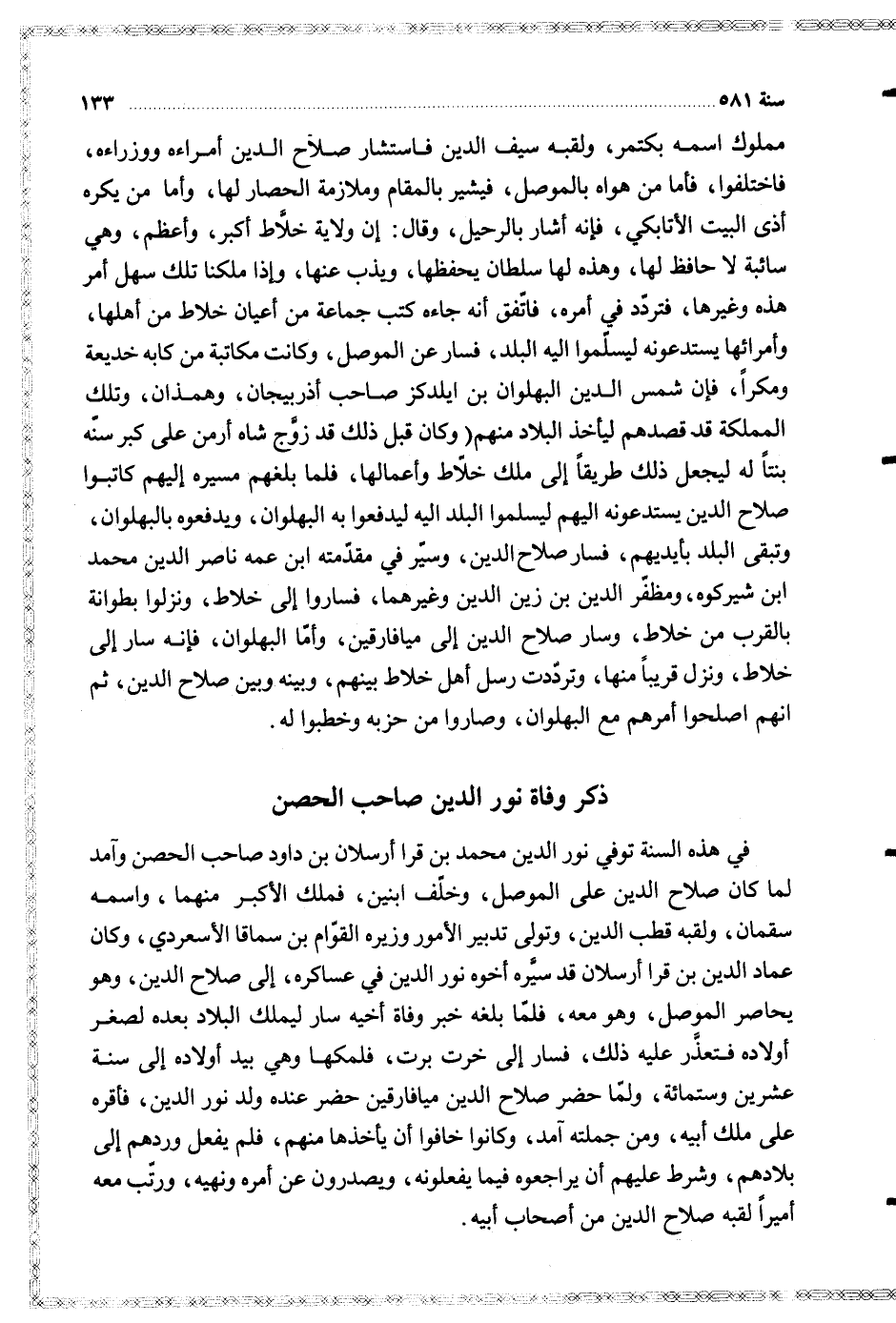 في هذه السنة توفي نور الدين محمد بن قرا أرسلان بن داود صاحب الحصن وآمد لما كان صلاح الدين على الموصل وخلف ابنين فملك الأكبر منهما واسمه سقمان ولقبه قطب الدين وتولى تدبير الأمور وزيره القوام بن سماقا الأسعردي وكان عماد الدين بن قرا أرسلان قد سيره أخوه نور الدين في عساكره إلى صلاح الدين وهو يحاصر الموصل وهو معه فلما بلغه خبر وفاة أخيه سار ليملك البلاد بعده لصغر أولاده فتعذر عليه ذلك فسار إلى خرت برت فلمكها وهي بيد أولاده إلى سنة عشرين وستمائة ولما حضر صلاح الدين ميافارقين حضر عنده ولد نور الدين فأقره على ملك أبيه ومن جملته آمد وكانوا خافوا أن يأخذها منهم فلم يفعل وردهم إلى بلادهم وشرط عليهم أن يراجعوه فيما يفعلونه ويصدون عن أمره ونهيه ورتب معه أميرا لقبه صلاح الدين من أصحاب أبيه