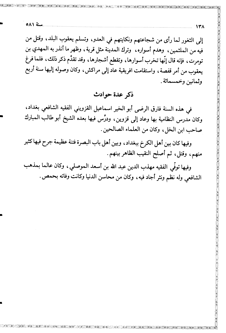 في هذه السنة فارق الرضى أبو الخير اسماعيل القزويني الفقيه الشافعي بغداد وكان مدرس النظامية بها وعاد إلى قزوين ودرس فيها بعده الشيخ أبو طالب المبارك صاحب ابن الخل وكان من العلماء الصالحين