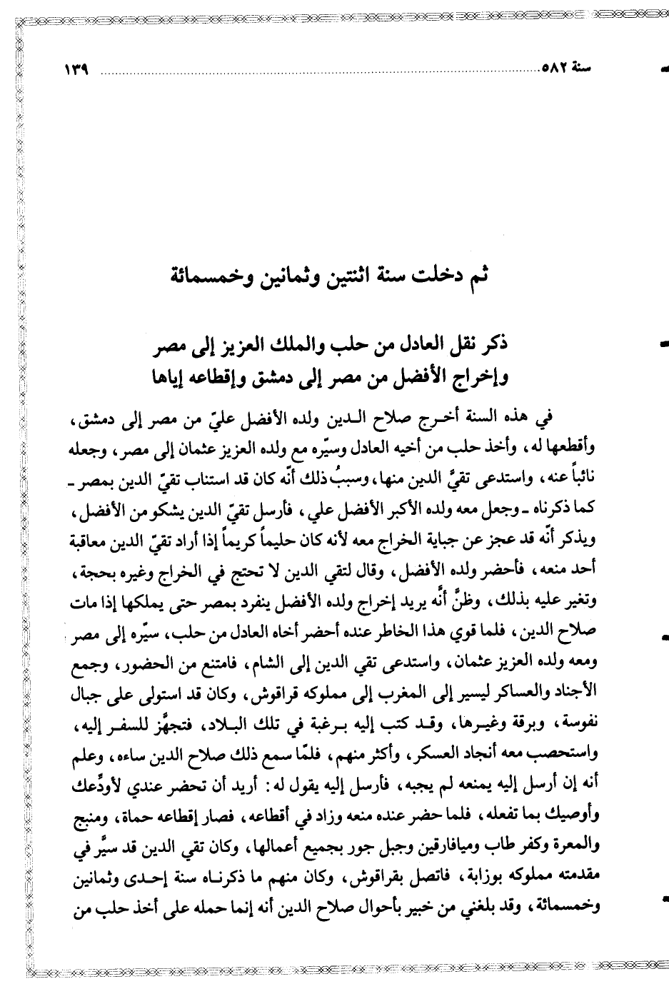 في هذه السنة أخرج صلاح الدين ولده الأفضل علي من مصر إلى دمشق وأقطعها له وأخذ حلب من أخيه العادل وسيره مع ولده العزيز عثمان إلى مصر وجعله نائبا عنه واستدعى تقي الدين منها وسبب ذلك أنه كان قد استناب تقي الدين بمصر كما ذكرناه وجعل معه ولده الأكبر الأفضل علي فأرسل تقي الدين يشكو من الأفضل ويذكر أنه قد عجز عن جباية الخراج معه لأنه كان حليما كريما إذا أراد تقي الدين معاقبة أحد منعه فأحضر ولده الأفضل وقال لتقي الدين لا تحتج في الخراج وغيره بحجة وتغير عليه بذلك وظن أنه يريد إخراج ولده الأفضل ينفرد بمصر حتى يملكها إذا مات صلاح الدين فلما قوي هذا الخاطر عنده أحضر أخاه العادل من حلب سيره إلى مصر ومعه ولده العزيز عثمان واستدعى تقي الدين إلى الشام فامتنع من الحضور وجمع الأجناد والعساكر ليسير إلى مملوكه قراقوش وكان قد استولى على جبال نفوسه وبرقة وغيرها وقد كتب إليه برغبة في تلك البلاد فتجهز للسفر إليه واستحصب معه أنجاد العسكر وأكثر منهم فلما سمع ذلك صلاح الدين ساءه وعلم أنه إن أرسل إليه يمنعه لم يجبه فأرسل إليه يقول له أريد أن تحضر عندي لأودعك وأوصيك بما تفعله فلما حضر عنده منعه وزاد في أقطاعه فصار إقطاعه حماة ومنبج والمعرة وكفر طاب وميافارقين وجبل جور بجميع أعمالها وكان تقي الدين قد سير في مقدمته مملوكه بوزابة فاتصل بقراقوش وكان منهم ما ذكرناه سنة إحدى وثمانين وخمسمائة وقد بلغني من خبير بأحوال صلاح الدين أنه إنما حمله على أخذ حلب من
