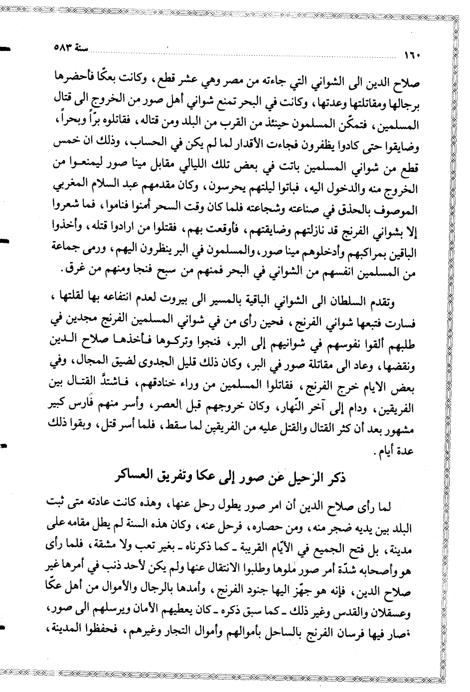 صلاح الدين الى الشواني التي جاءته من مصر وهي عشر قطع وكانت بعكا فأحضرها برجالها ومقاتلتها وعدتها وكانت في البحر تمنع شواني أهل صور من الخروج الى قتال المسلمين فتمكن المسلمون حينئذ من القرب من البلد ومن قتاله فقاتلوه برا وبحرا وضايقوا حتى كادوا يظفرون فجاءت الأقدار لما لم يكن في الحساب وذلك ان خمس قطع من شواني المسلمين باتت في بعض تلك الليالي مقابل مينا صور ليمنعوا من الخروج منه والدخول اليه فباتوا ليلتهم يحرسون وكان مقدمهم عبد السلام المغربي الموصوف بالحذف في صناعته وشجاعته فلما كان وقت السحر أمنوا فناموا فما شعروا إلا بشواني الفرنج قد نازلتهم وضايقتهم فأوقعت بهم فقتلوا من ارادوا قتله وأخذوا الباقين بمراكبهم وأدخلوهم مينا صور والمسلمون في البر ينظرون اليهم ورمى جماعة من المسلمين انفسهم من الشواني في البحر فمنهم من سبح فنجا ومنهم من غرق