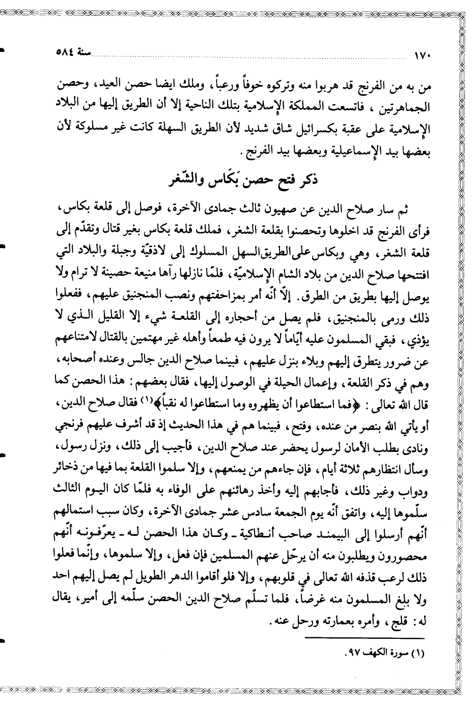 من به من الفرنج قد هربوا منه وتركوه خوفا ورعبا وملك ايضا حصن العيد وحصن الجماهرتين فاتسعت المملكة الإسلامية بتلك الناحية إلا أن الطريق إليها من البلاد الإسلامية على عقبة بكسرائيل شاق شديد لأن الطريق السهلة كانت غير مسلوكة لأن بعضها بيد الإسماعيلية وبعضها بيد الفرنج