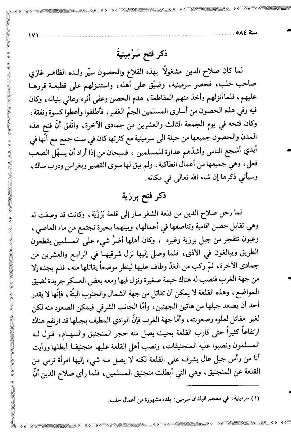 لما كان صلاح الدين مشغولا بهذه القلاع والحصون سير ولده الظاهر غازي صاحب حلب فحصر سرمينية وضيق على أهله واستنزلهم على قطيعة قررها عليهم فلما أنزلهم وأخذ منهم المقاطعة هدم الحصن وعفى أثره وعالي بنيانه وكان فيه وفي هذه الحصون من أسارى المسلمين الجم الغفير فأطلقوا وأعطوا كسوة ونفقة وكان فتحه في يوم الجمعة الثالث والعشرين من جمادى الآخرة واتفق أن فتح هذه المدن والحصون جميعها من جبلة الى سرمينية مع كثرتها كان في ست جمع مع أنها في أيدي أشجع الناس وأشدهم عداوة للمسلمين فسبحان من إذا أراد أن يسهل الصعب فعل وهي جميعها من أعمال انطاكية ولم يبق لها سوى القصير وبغراس ودرب ساك وسيأتي ذكرها إن شاء الله تعالى في مكانه