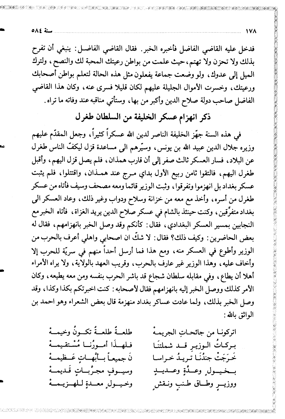 في هذه السنة جهز الخليفة الناصر لدين الله عسكرا كثيرا وجعل المقدم عليهم وزيره جلال الدين عبيد الله بن يونس وسيرهم الى مساعدة قزل ليكف الناس طغرل عن البلاد فسار العسكر ثالث صفر إلى أن قارب همذان فلم يصل قزل اليهم وأقبل طغرل اليهم فالتقوا ثامن ربيع الأول بداي مرج عند همذان واقتتلوا فلم يثبت عسكر بغداد بل انهزموا وتفرقوا وثبت الوزير قائما ومعه مصحف وسيف فأتاه من عسكر طغرل من أسره وأخذ مع معه من خزانة وسلاح ودواب وغير ذلك وعاد العسكر الى بغداد متفرقين وكنت حينئذ بالشام في عسكر صلاح الدين يريد الغزاة فأتاه الخبر مع النجابين بمسير العسكر البغدادي فقال كأنكم وقد وصل الخبر بانهزامهم فقال له بعض الحاضرين وكيف ذلك فقال لا شك ان اصحابي واهلي أعرف بالحرب من الوزير وأطوع في العسكر منه ومع هذا فما أرسل أحدا منهم في سرية للحرب إلا وأخاف عليه وهذا الوزير غير عارف بالحرب وقريب العهد بالولاية ولا يراه الأمراء أهلا أن يطاع وفي مقابله سلطان شجاع قد باشر الحرب بنفسه ومن معه يطيعه وكان الأمر كذلك ووصل الخبر إليه بانهزامهم فقال لأصحابه كنت اخبرتكم بكذا وكذا وقد وصل الخبر بذلك ولما عادت عساكر بغداد منهزمة قال بعض الشعراء وهو احمد بن الواثق بالله