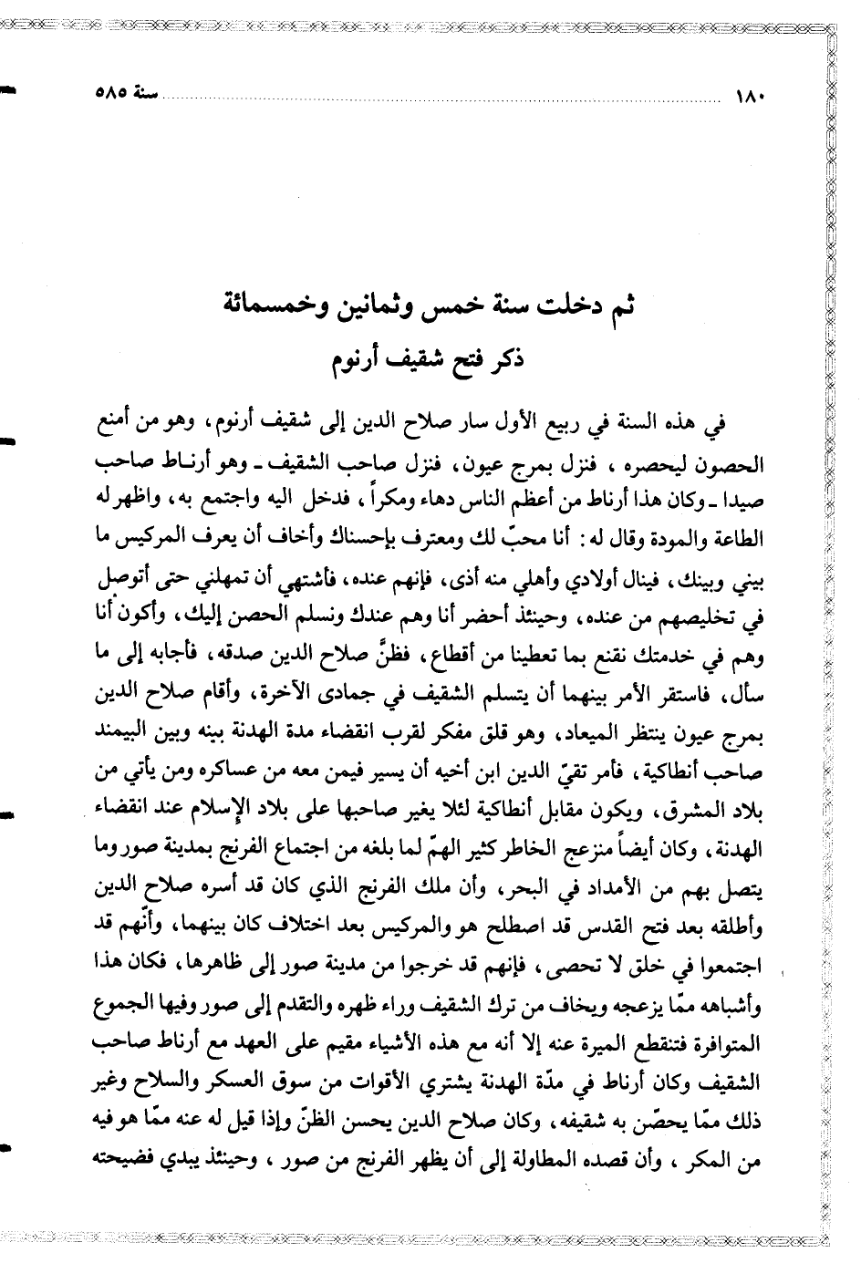 في هذه السنة في ربيع الأول سار صلاح الدين إلى شقيف أرنوم وهو من أمنع الحصون ليحصره فنزل بمرج عيون فنزل صاحب الشقيف وهو أرناط صاحب صيدا وكان هذا أرناط من أعظم الناس دهاء ومكرا فدخل اليه واجتمع به واظهر له الطاعة والمودة وقال له أنا محب لك ومعترف بإحسناك وأخاف أن يعرف المركيس ما بيني وبينك فينال أولادي وأهلي منه أذى فإنهم عنده فأشتهى أن تمهلني حتى أتوصل في تخليصهم من عنده وحينئذ أحضر أنا وهم عندك ونسلم الحصن إليك وأكون أنا وهم في خدمتك نقنع بما تعطينا من أقطاع فظن صلاح الدين صدقه فأجابه إلى ما سأل فاستقر الأمر بينهما أن يتسلم الشقيف في جمادى الآخرة وأقام صلاح الدين بمرج عيون ينتظر الميعاد وهو مفكر لقرب انقضاء مدة الهدنة بينه وبين البيمند صاحب أنطاكية فأمر تقي الدين ابن أخيه أن يسير فيمن معه من عساكره ومن يأتي من بلاد المشرق ويكون مقابل أنطاكية لئلا يغير صاحبها على بلاد الإسلام عند انقضاء الهدنة وكان أيضا منزعج الخاطر كثير الهم لما بلغه من اجتماع الفرنج بمدينة صور وما يتصل بهم من الأمداد في البحر وأن ملك الفرنج الذي كان قد أسره صلاح الدين وأطلقه بعد فتح القدس قد اصطلح هو والمركيس بعد اختلاف كان بينهما وأنهم قد اجتمعوا في خلق لا تحصى فإنهم قد خرجوا من مدينة صور إلى ظاهرها فكان هذا وأشباهه مما يزعجه ويخاف من ترك الشقيف وراء ظهره والتقدم إلى صور وفيها الجموع المتوافرة فتنقطع الميرة عنه إلا أنه مع هذه الأشياء مقيم على العهد مع أرناط صاحب الشقيف وكان أرناط في مدة الهدنة يشتري الأقوات من سوق العسكر والسلاح وغير ذلك مما يحصن به شقيفه وكان صلاح الدين يحسن الظن وإذا قيل له عنه مما هو فيه من المكر وأن قصده المطاولة إلى أن يظهر الفرنج من صور وحينئذ يبدي فضيحته