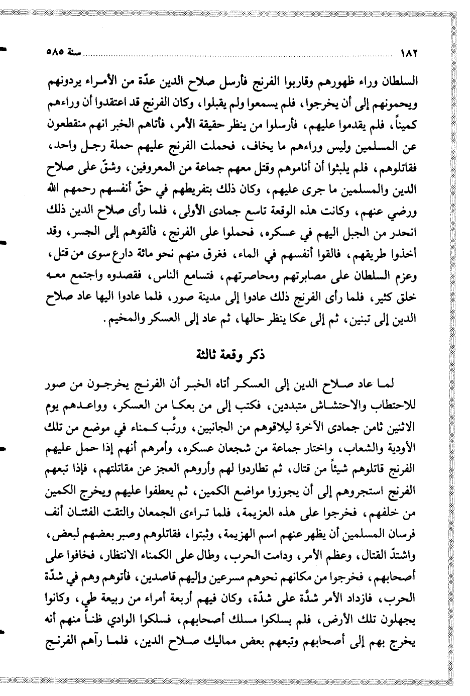 السلطان وراء ظهورهم وقاربوا الفرنج فأرسل صلاح الدين عدة من الأمراء يردونهم ويحمونهم إلى أن يخرجوا فلم يسمعوا ولم يقبلوا وكان الفرنج قد اعتقدوا أن وراءهم كمينا فلم يقدموا عليهم فأرسلوا من ينظر حقيقة الأمر فأتاهم الخبر انهم منقطعون عن المسلمين وليس وراءهم ما يخاف فحملت الفرنج عليهم حملة رجل واحد فقاتلوهم فلم يلبثوا أن أناموهم وقتل معهم جماعة من المعروفين وشق على صلاح الدين والمسلمين ما جرى عليهم وكان ذلك بتفريطهم في حق أنفسهم رحمهم الله ورضي عنهم وكانت هذه الوقعة تاسع جمادى الأولى فلما رأى صلاح الدين ذلك انحدر من الجبل اليهم في عسكره فحملوا على الفرنج فألقوهم إلى الجسر وقد اخذوا طريقهم فالقوا أنفسهم في الماء فغرق منهم نحو مائة دراع سوى من قتل وعزم السلطان على مصابرتهم ومحاصرتهم فتسامع الناس فقصدوه واجتمع معه خلق كثير فلما رأى الفرنج ذلك عادوا إلى مدينة صور فلما عادوا اليها عاد صلاح الدين إلى تبنين ثم إلى عكا ينظر حالها ثم عاد إلى العسكر والمخيم