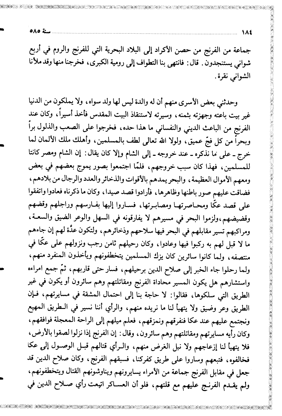 وحدثني بعض الأسرى منهم أن له والدة ليس لها ولد سواه ولا يملكون من الدنيا غير بيت باعته وجهزته بثمنه وسيرته لاستنقاذ البيت المقدس فأخذ أسيرا وكان عند الفرنج من الباعث الديني والنفساني ما هذا حده فخرجوا على الصعب والذلول برا وبحرا من كل فج عميق ولولا الله تعالى لطف بالمسلمين وأهلك ملك الألمان لما خرج على ما نذكره عند خروجه إلى الشام وإلا كان يقال إن الشام ومصر كانتا للمسلمين فهذا كان سبب خروجهم فلما اجتمعوا بصور يموج بعضهم في بعض ومعهم الأموال العظيمة والبحر يمدهم بالأقوات والذخائر والعدد والرجال من بلادهم فضاقت عليهم صور باطنها وظاهرها فأرادوا قصد صيدا وكان ما ذكرناه فعادوا واتفقوا على قصد عكا ومحاصرتها ومصابرتها فساروا إليها بفارسهم وراجلهم وقضهم وقضيضهم ولزموا البحر في مسيرهم لا يفارقونه في السهل والوعر الضيق والسعة ومراكبهم تسير مقابلهم في البحر فيها سلاحهم وذخائرهم ولتكون عدة لهم إن جاءهم ما لا قبل لهم به ركبوا فيها وعادوا وكان رحيلهم ثامن رجب ونزولهم على عكا في منتصفه ولما كانوا سائرين كان يزك المسلمين يتخطفونهم ويأخذون المنفرد منهم ولما رحلوا جاء الخب إلى صلاح الدين برحيلهم فسار حتى قاربهم ثم جمع امراءه واستشارهم هل يكون المسير محاداة الفرنج ومقاتلتهم وهم سائرون أو يكون في غير الطريق التي سلكوها فقالوا لا حاجة بنا إلى احتمال المشقة في مسايرتهم فإن الطريق وعر وضيق ولا يتهيأ لنا ما نريده منهم والرأي أننا نسير في الطريق المهيع ونجتمع عليهم عند عكا فنفرقهم ونمزقهم فعلم ميلهم إلى الراحة المعجلة فوافقهم وكان رأيه مسايرتهم ومقاتلتهم وهم سائرون وقال إن الفرنج إذا نزلوا لصقوا بالأرض فلا يتهيأ لنا إزعاجهم ولا نيل الغرض منهم والرأي قتالهم قبل الوصول إلى عكا فخالفوه فتبعهم وساروا على طريق كفركنا فسبقهم الفرنج وكان صلاح الدين قد جعل في مقابل الفرنج جماعة من الأمراء يسايرونهم ويناوشونهم القتال ويتخطفونهم ولم يقدم الفرنج عليهم مع قلتهم فلو أن العساكر اتبعت رأى صلاح الدين في