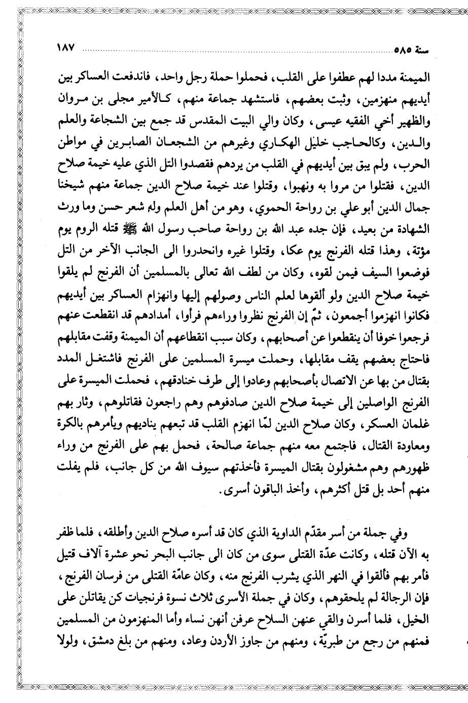 الميمنة مددا لهم عطفوا على القلب فحملوا حملة رجل واحد فاندفعت العساكر بين أيديهم منهزمين وثبت بعضهم فاستشهد جماعة منهم كالأمير مجلى بن مروان والظهير أخي الفقيه عيسى وكان والي البيت المقدس قد جمع بين الشجاعة والعلم والدين وكالحاجب خليل الهلكاري وغيرهم من الشجعان الصابرين في مواطن الحرب ولم يبق بين أيديهم في القلب من يردهم فقصدوا التل الذي عليه خيمة صلاح الدين فقتلوا من مروا به ونهبوا وقتلوا عند خيمة صلاح الدين جماعة منهم شيخنا جمال الدين أبو علي بن رواحة الحموي وهو من أهل العلم وله شعر حسن وما ورث الشهادة من بعيد فإن جده عبد الله بن رواحة صاحب رسول الله قتله الروم يوم مؤته وهذا قتله الفرنج يوم عكا وقتلوا غيره وانحدروا الى الجانب الآخر من التل فوضعوا السيف فيمن لقوه وكان من لطف الله تعالى بالمسلمين أن الفرنج لم يلقوا خيمة صلاح الدين ولو ألقوها لعلم الناس وصولهم إليها وانهزام العساكر بين أيديهم فكانوا انهزموا أجمعون ثم إن الفرنج نظروا وراءهم فرأوا أمدادهم قد انقطعت عنهم فرجعوا خوفا أن ينقطعوا عن أصحابهم وكان سبب انقطاعهم أن الميمنة وقفت مقابلهم فاحتاج بعضهم يقف مقابلها وحملت ميسرة المسلمين على الفرنج فاستغل المدد بقتال الواصلين إلى خيمة صلاح الدين صادفوهم وهم راجعون فقاتلوهم وثار بهم غلمان العسكر وكان صلاح الدين لما انهزم القلب قد تبعهم يناديهم ويأمرهم بالكرة ومعاودة القتال فاجتمع معه منهم جماعة صالحة فحمل بهم على الفرنج من وراء ظهورهم وهم مشغولون بقتال الميسرة فأخذتهم سيوف الله من كل جانب فلم يفلت منهم أحد بل قتل أكثرهم وأخذ الباقون أسرى