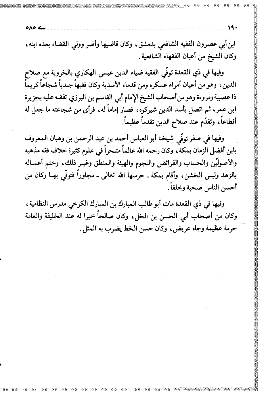 وفيها في ذي القعدة توفي الفقيه ضياء الدين عيسى الهكاري بالخروبة مع صلاح الدين وهو من أعيان أمراء عسكره ومن قدماء الأسدية وكان فقيها جنديا شجاعا كريما ذا عصبية ومروءة وهو من أصحاب الشيخ الإمام أبي القاسم بن البرزي تفقه عليه بجزيرة ابن عمر ثم اتصل بأسد الدين شيركوه فصار إماما له فرأى من شجاعته ما جعل له أقطاعا وتقدم عند صلاح الدين تقدما عظيما