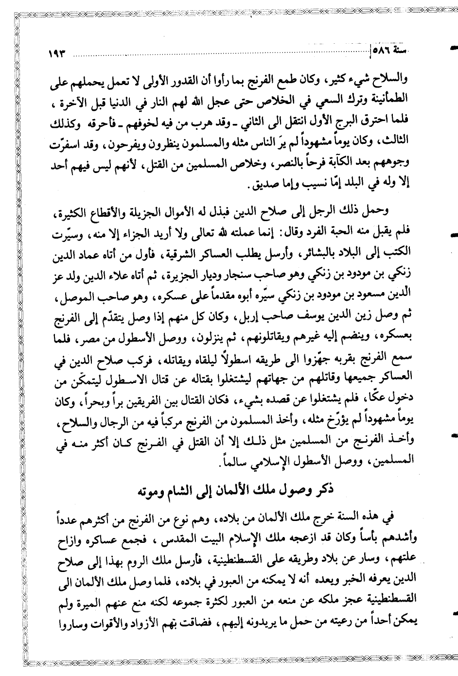 في هذه السنة خرج ملك الألمان من بلاده وهم نوع من الفرنج من أكثرهم عددا وأشدهم بأسا وكان قد ازعجه ملك الإسلام البيت المقدس فجمع عساكره وازاح علتهم وسار عن بلاد وطريقه على القسطنطينية فأرسل ملك الروم بهذا إلى صلاح الدين يعرفه الخبر ويعده أنه لا يمكنه من العبور في بلاده فلما وصل ملك الألمان الى القسطنطينية عجز ملكه عن منعه من العبور لكثرة جموعه لكنه منع عنهم الميرة ولم يمكن أحدا من رعيته من حمل ما يريدونه إليهم فضاقت بهم الأزواد والأقوات وساروا