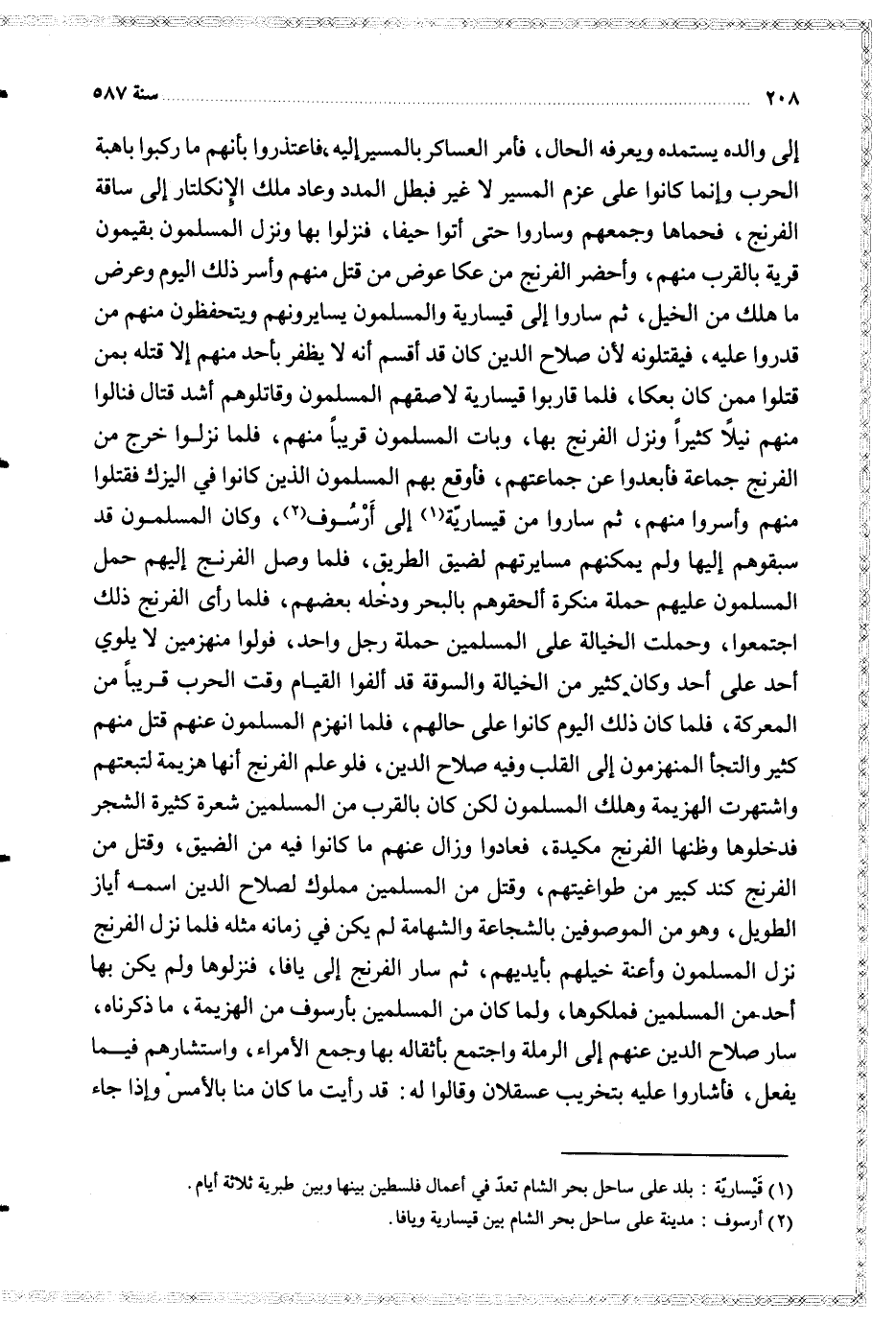 إلى والده يستمده ويعرفه الحال فأمر العساكر بالمسير إليه فاعتذروا بأنهم ما ركبوا باهبة الحرب وإنما كانوا على عزم المسير لا غير فبطل المدد وعاد ملك الإنكلتار إلى ساقة الفرنج فحماها وجمعهم وساروا حتى أتوا حيفا فنزلوا بها ونزل المسلمون بقيمون قرية بالقرب منهم وأحضر الفرنج من عكا عوض من قتل منهم وأسر ذلك اليوم وعرض ما هلك من الخيل ثم ساروا إلى قيسارية والمسلمون يسايرونهم ويتحفظون منهم من قدروا عليه فيقتلونه لأن صلاح الدين كان قد أقسم أنه لا يظفر بأحد منهم إلا قتله بمن قتلوا ممن كان بعكا فلما قاربوا قيسارية لاصقهم المسلمون وقاتلوهم أشد قتال فنالوا منهم نيلا كثيرا ونزل الفرنج بها وبات المسلمون قريبا منهم فلما نزلوا خرج من الفرنج جماعة فأبعدوا عن جماعتهم فأوقع بهم المسلمون الذين كانوا في اليزك فقتلوا منهم وأسروا منهم ثم ساروا من قيسارية إلى أرسوف وكان المسلمون قد سبقوهم إليها ولم يمكنهم مسايرتهم لضيق الطريق فلما وصل الفرنج إليهم حمل المسلمون عليهم حملة منكرة ألحقوهم بالبحر ودخله بعضهم فلما رأى الفرنج ذلك اجتمعوا وحملت الخيالة على المسلمين حملة رجل واحد فولوا منهزمين لا يلوي أحد على أحد وكان كثير من الخيالة والسوقة قد ألفوا القيام وقت الحرب قريبا من المعركة فلما كان ذلك اليوم كانوا على حالهم فلما انهزم المسلمون عنهم قتل منهم كثير والتجأ المنهزمون إلى القلب وفيه صلاح الدين فلو علم الفرنج أنها هزيمة لتبعتهم واشتهرت الهزيمة وهلك المسلمون لكن كان بالقرب من المسلمين شعرة كثيرة الشجر فدخلوها وظنها الفرنج مكيدة فعادوا وزال عنهم ما كانوا فيه من الضيق وقتل من الفرنج كند كبير من طواغيتهم وقتل من المسلمين مملوك لصلاح الدين اسمه أياز الطويل وهو من الموصوفين بالشجاعة والشهامة لم يكن في زمانه مثله فلما نزل الفرنج نزل المسلمون وأعنة خيلهم بأيديهم ثم سار الفرنج إلى يافا فنزلوها ولم يكن بها أحد من المسلمين فملكوها ولما كان من المسلمين بأرسوف من الهزيمة ما ذكرناه سار صلاح الدين عنهم إلى الرملة واجتمع بأثقاله بها وجمع الأمراء واستشارهم فيما يفعل فأشاروا عليه بتخريب عسقلان وقالوا له قد رأيت ما كان منا بالأمس وإذا جاء