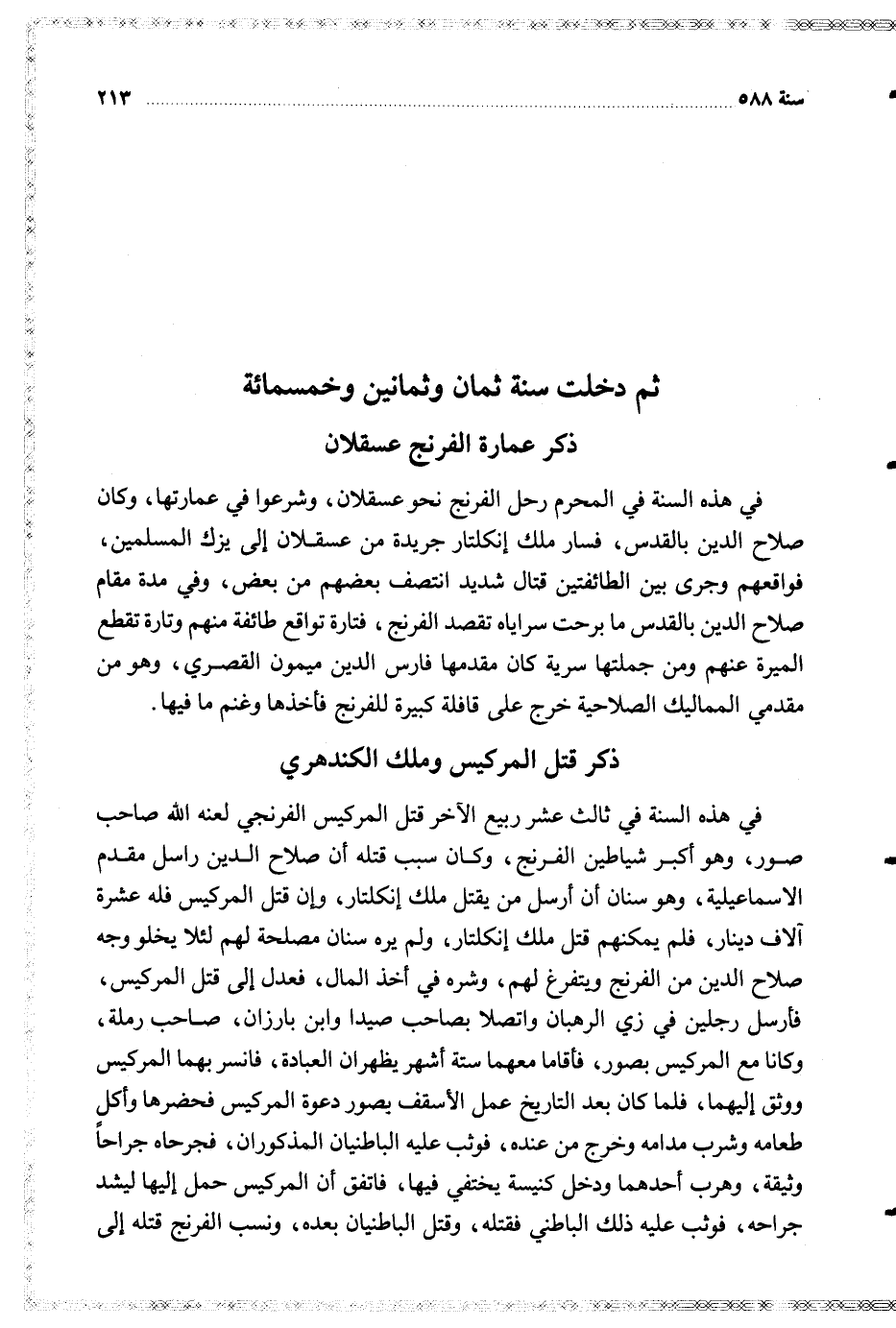 في هذه السنة في ثالث عشر ربيع الآخر قتل المركيس الفرنجي لعنه الله صاحب صور وهو أكبر شياطين الفرنج وكان سبب قتله أن صلاح الدين راسل مقدم الاسماعيلية وهو سنان أن أرسل من يقتل ملك إنكلتار وإن قتل المركيس فله عشرة آلاف دينار فلم يمكنهم قتل ملك إنكلتار ولم يره سنان مصلحة لهم لئلا يخلو وجه صلاح الدين من الفرنج ويتفرغ لهم وشره في أخذ المال فعدل إلى قتل المركيس فأرسل رجلين في زي الرهبان واتصلا بصاحب صيدا وابن بارزان صاحب رملة وكانا مع المركيس بصور فأقاما معهما ستة أشهر يظهران العبادة فانسر بهما المركيس ووثق إليهما فلما كان بعد التاريخ عمل الأسقف بصور دعوة المركيس فحضرها وأكل طعامه وشرب مدامه وخرج من عنده فوثب عليه الباطنيان المذكوران فجرحاه جراحا وثيقة وهرب أحدهما ودخل كنيسة يختفي فيها فاتفق أن المركيس حمل إليها ليشد جراحه فوثب عليه ذلك الباطني فقتله وقتل الباطنيان بعده ونسب الفرنج قتله إلى