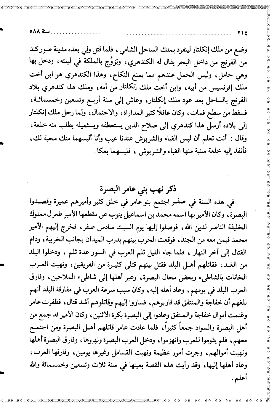 في هذه السنة في صفر اجتمع بنو عامر في خلق كثير وأميرهم عميرة وقصدوا البصرة وكان الأمير بها اسمه محمد بن اسماعيل ينوب عن مقطعها الأمير طغرل مملوك الخليفة الناصر لدين الله فوصلوا إليها يوم السبت سادس صفر فخرج إليهم الأمير محمد فيمن معه من الجند فوقعت الحرب بينهم بدرب الميدان بجانب الخريبة ودام القتال إلى آخر النهار فلما جاء الليل ثلم العرب في السور عدة ثلم ودخلوا البلد من الغد فقاتلهم أهل البلد فقتل بينهم قتلى كثيرة من الفريقين ونهبت العرب الخانات بالشاطئ وبعض محال البصرة وعبر أهلها إلى شاطئ الملاحين وفارق العرب البلد في يومهم وعاد أهله إليه وكان سبب سرعة العرب في مفارقة البلد أنهم بلغهم أن خفاجة والمنتفق وعادوا إلى البصرة بكرة الاثنين وكان الأمير قد جمع من أهل البصرة والسواد جمعا كثيرا فلما عادت عامر قاتلهم أهل البصرة ومن اجتمع معهم فلم يقوموا للعرب وانهزموا ودخل العرب البصرة ونهبوها وفارق البصرة أهلها ونهبت أموالهم وجرت أمور عظيمة ونهبت القسامل وغيرها يومين وفارقها العرب وعاد أهلها إليها وقد رأيت هذه القصة بعينها في سنة ثلاث وتسعين وخمسمائة والله أعلم