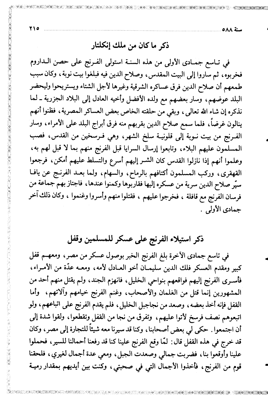 في تاسع جمادى الآخرة بلغ الفرنج الخبر بوصول عسكر من مصر ومعهم قفل كبير ومقدم العسكر فلك الدين سليمان أخو العادل لأمه ومعه عدة من الأمراء فأسرى الفرنج إليهم فواقعهم بنواحي الخليل فانهزم الجند ولم يقتل منهم أحد من المشهورين إنما قتل من الغلمان والأصحاب وغنم الفرنج خيامهم وآلاتهم وأما القفل فإنه أخذ بعضه وصعد من نجاجبل الخليل فلم يقدم الفرنج على اتباعهم ولو اتبعوهم نصف فرسخ لأتوا عليهم وتفرق من نجا من القفل وتقطعوا ولقوا شدة إلى أن اجتمعوا