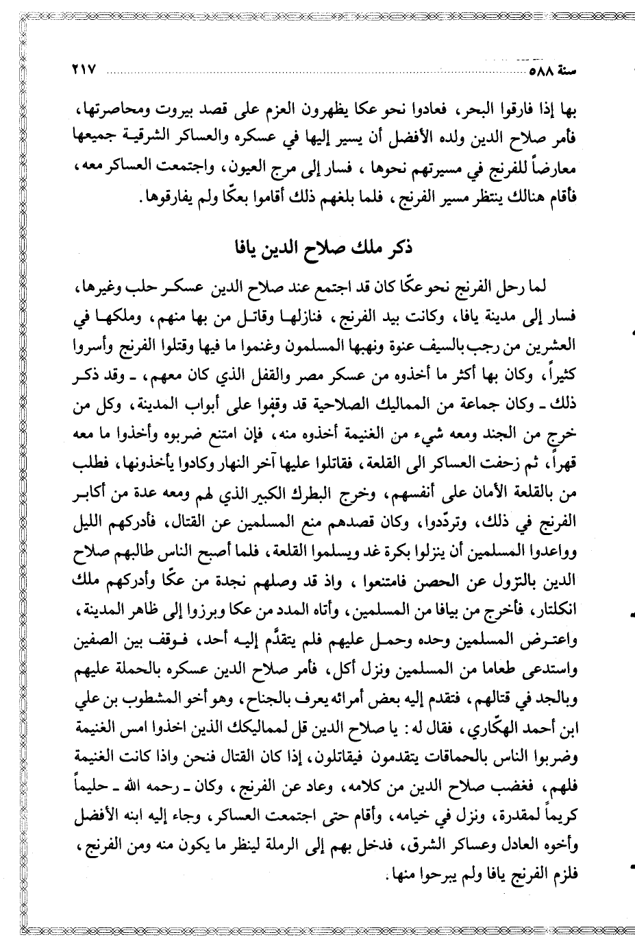 لما رحل الفرنج نحو عكا كان قد اجتمع عند صلاح الدين عسكر حلب وغيرها فسار إلى مدينة يافا وكانت بيد الفرنج فنازلها وقاتل من بها منهم وملكها في العشرين من رجب بالسيف عنوة ونهبها المسلمون وغنموا ما فيها وقتلوا الفرنج وأسروا كثيرا وكان بها أكثر ما أخذوه من عسكر مصر والقفل الذي كان معهم وقد ذكر ذلك وكان جماعة من المماليك الصلاحية قد وقفوا على أبواب المدينة وكل من خرج من الجند ومعه شيء من الغنيمة أخذوه منه فإن امتنع ضربوه وأخذوا ما معه قهرا ثم زحفت العساكر الى القلعة فقاتلوا عليها آخر النهار وكادوا يأخذونها فطلب من بالقلعة الأمان على أنفسهم وخرج البطرك الكبير الذي لهم ومعه عدة من أكابر الفرنج في ذلك وترددوا وكان قصدهم منع المسلمين عن القتال فأدركهم الليل وواعدوا المسلمين أن ينزلوا بكرة غد ويسلموا القلعة فلما أصبح الناس طالبهم صلاح الدين بالنزول عن الحصن فامتنعوا واذ قد وصلهم نجدة من عكا وأدركهم ملك انكلتار فأخرج من بيافا من المسلمين وأتاه المدد من عكا وبرزوا إلى ظاهر المدينة واعترض المسلمين وحده وحمل عليهم فلم يتقدم إليه أحد فوقف بين الصفين واستدعى طعاما من المسلمين ونزل أكل فأمر صلاح الدين عسكره بالحملة عليهم وبالجد في قتالهم فتقدم إليه بعض أمرائه يعرف بالجناح وهو أخو المشطوب بن علي ابن أحمد الهكاري فقال له يا صلاح الدين قل لمماليكك الذين اخذوا امس الغنيمة وضربوا الناس بالحماقات يتقدمون فيقاتلون إذا كان القتال فنحن واذا كانت الغنيمة فلهم فغضب صلاح الدين من كلامه وعاد عن الفرنج وكان رحمه الله حليما كريما لمقدرة ونزل في خيامه وأقام حتى اجتمعت العساكر وجاء إليه ابنه الأفضل وأخوه العادل وعساكر الشرق فدخل بهم إلى الرملة لينظر ما يكون منه ومن الفرنج فلزم الفرنج يافا ولم يبرحوا منها