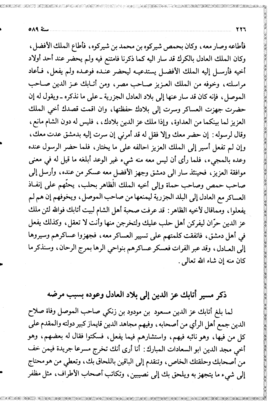 فأطاعه وصار معه وكان بحمص شيركوه بن محمد بن شيركوه فأطاع الملك الأفضل وكان الملك العادل بالكرك قد سار اليه كما ذكرنا فامنع فيه ولم يحضر عند أحد أولاد أخيه فأرسل إليه الملك الأفضل يستدعيه ليحضر عنده فوعده ولم يفعل فأعاد مراسلته وخوفه من الملك العزيز صاحب مصر ومن أتابك عز الدين صاحب الموصل فإنه كان قد سار عنها إلى بلاد العادل الجزرية على ما نذكره ويقول له إن حضرت جهزت العساكر وسرت إلى بلادك حفظتها وان اقمت قصدك أخي الملك العزيز لما بينكما من العداوة وإذا ملك عز الدين بلادك فليس له دون الشام مانع وقال لرسوله إن حضر معك وإلا فقل له قد أمرني إن سرت إليه بدمشق عدت معك وإن لم تفعل أسير إلى الملك العزيز احالفه على ما يختار فلما حضر الرسول عنده وعده بالمجيء فلما رأى أن ليس معه منه شيء غير الوعد أبلغه ما قيل له في معنى موافقة العزيز فحينئذ سار الى دمشق وجهز الأفضل معه عسكر من عنده وأرسل إلى صاحب حمص وصاحب حماة وإلى أخيه الملك الظاهر بحلب يحثهم على إنفاذ العساكر مع العادل إلى البلد الجزرية ليمنعها من صاحب الموصل ويخوفهم إن هم لم يفعلوا ومما قال لأخيه الظاهر قد عرفت صحبة أهل الشام لبيت أتابك فوالله لئن ملك عز الدين حران ليفركن أهل حلب عليك ولتخرجن منها وأنت لا تعقل وكذلك يفعل في أهل دمشق فاتفقت كلمتهم على تسيير العساكر معه فجهزوا عساكرهم وسيروها إلى العادل وقد عبر الفرات فعسكر عساكرهم بنواحي الرها بمرج الرحان وسنذكر ما كان منه إن شاء الله تعالى