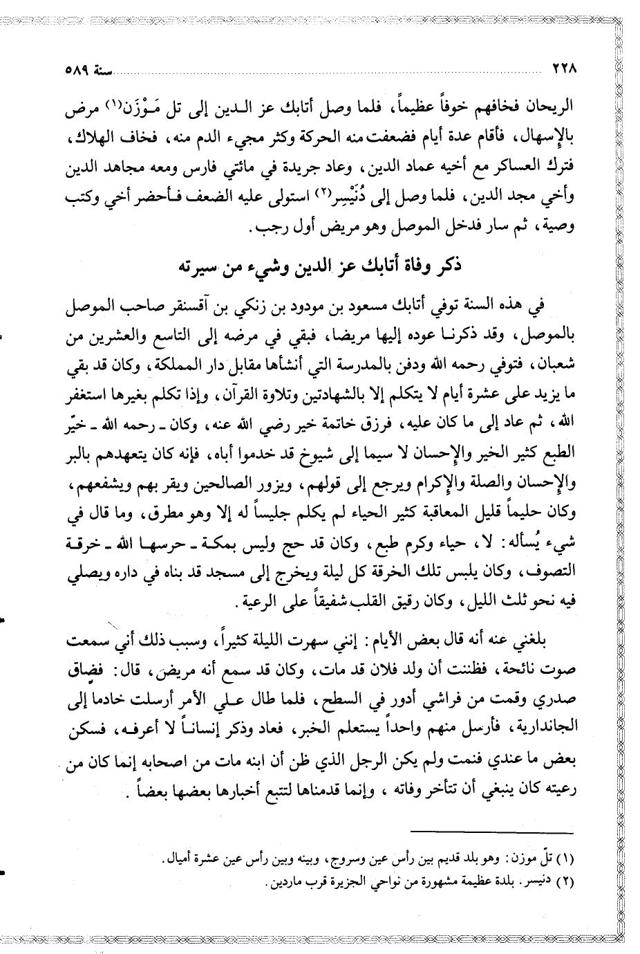 الريحان فخافهم خوفا عظيما فلما وصل أتابك عز الدين إلى تل موزن مرض بالإسهال فأقام عدة أيام فضعفت منه الحركة وكثر مجيء الدم منه فخاف الهلاك فترك العساكر مع لأخيه عماد الدين وعاد جريدة في مائتي فارس ومعه مجاهد الدين وأخي مجد الدين فلما وصل إلى دنيسر استولى عليه الضعف فأحضر أخي وكتب وصية ثم سار فدخل الموصل وهو مريض أول رجب