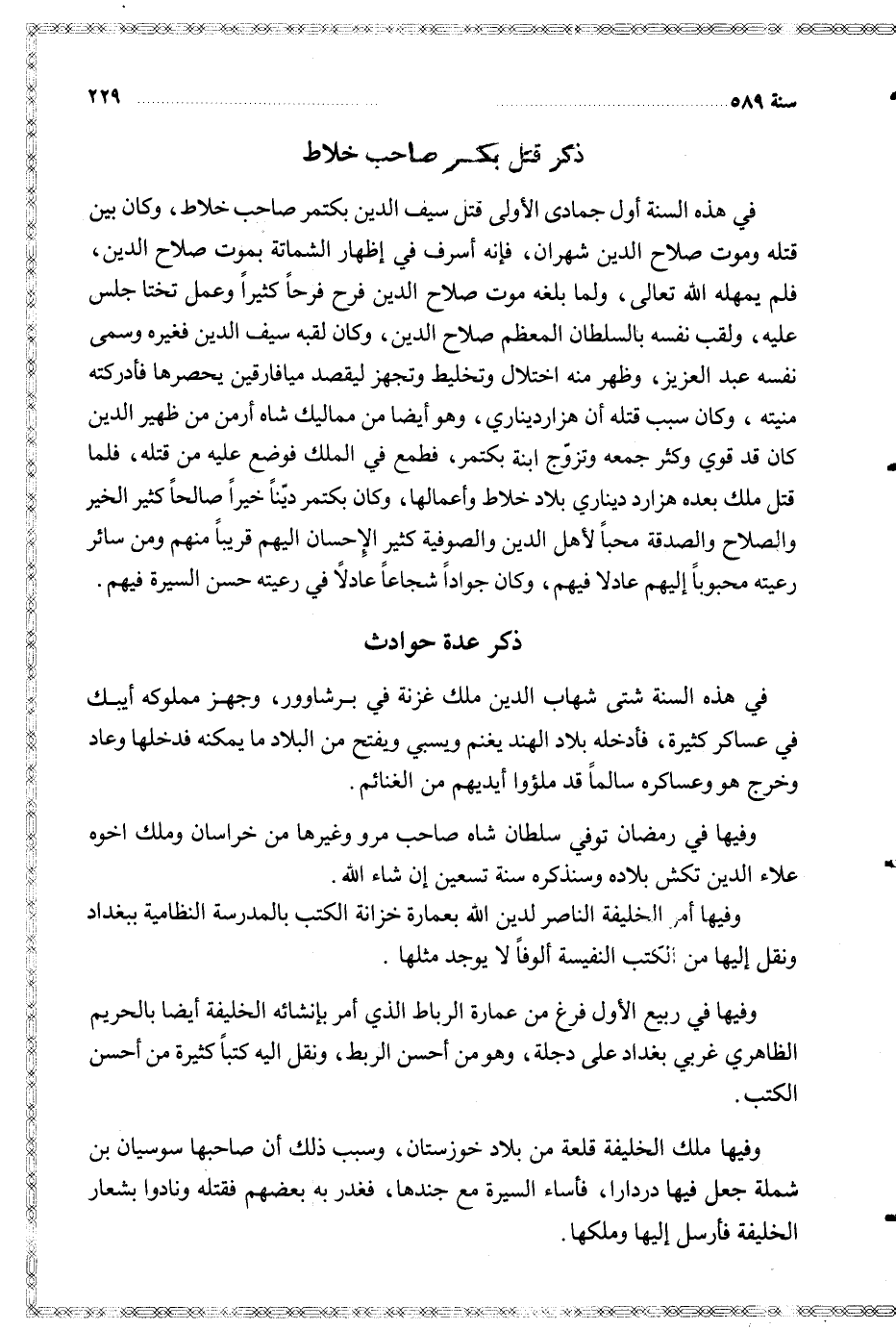 وفيها أمر الخليفة الناصر لدين الله بعمارة خزانة الكتب بالمدرسة النظامية ببغداد ونقل إليها من الكتب النفسية ألوفا لا يوجد مثلها