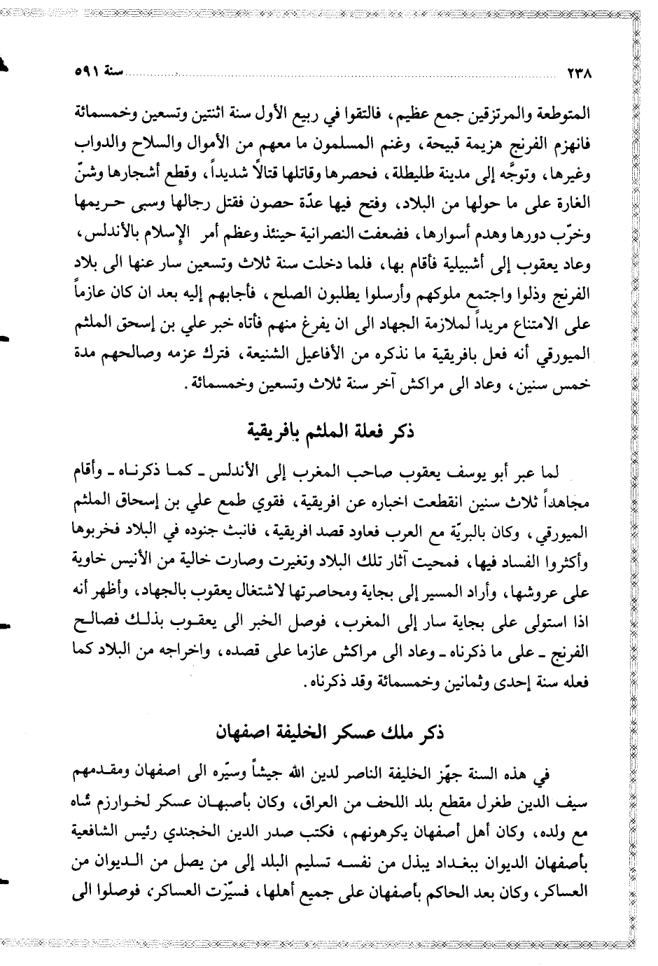 المتوطعة والمرتزقين جمع عظيم فالتقوا في ربيع الأول سنة اثنتين وتسعين وخمسمائة فانهزم الفرنج هزيمة قبيحة وغنم المسلمون ما معهم من الأموال والسلاح والدواب وغيرها وتوجه إلى مدينة طليطلة فحصرها وقاتلها قتالا شديدا وقطع أشجارها وشن الغارة على ما حولها من البلاد وفتح فيها عدة حصون فقتل رجالها وسبى حريمها وخرب دورها وهدم أسوارها فضعفت النصرانية حينئذ وعظم أمر الإسلام بالأندلس وعاد يقوب إلى أشبيلية فأقام بها فلما دخلت سنة ثلاث وتسعين سار عنها الى بلاد الفرنج وذلوا واجتمع ملوكهم وأرسلوا يطلبون الصلح فأجابهم إليه بعد ان كان عازما على الامتناع مريدا لملازمة الجهاد الى ان يفرغ منهم فأتاه خبر علي بن إسحق الملثم تاميورقي أنه فعل بافريقية ما نذكره من الأفاعيل الشنيعة فترك عزمه وصالحهم مدة خمس سنين وعاد الى مراكش آخر سنة ثلاث وتسعين وخمسمائة
